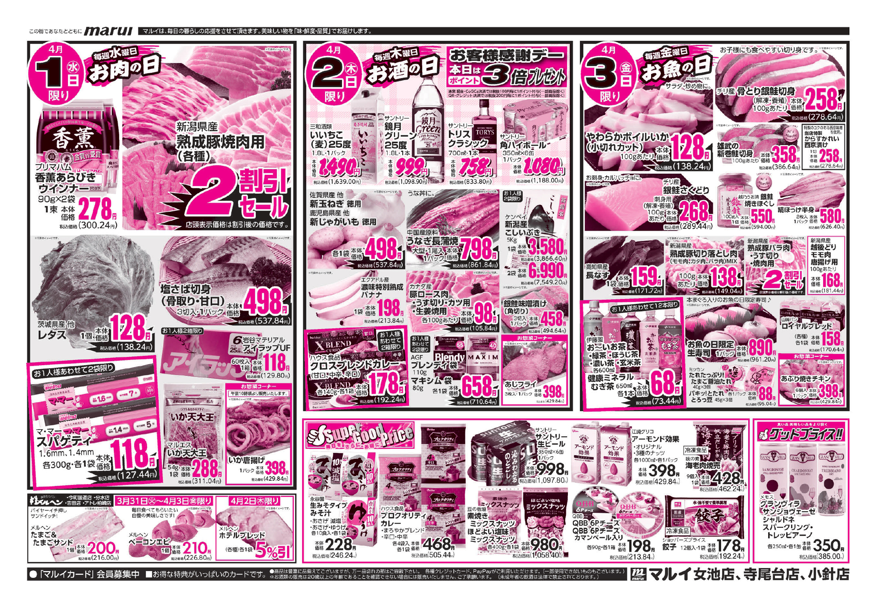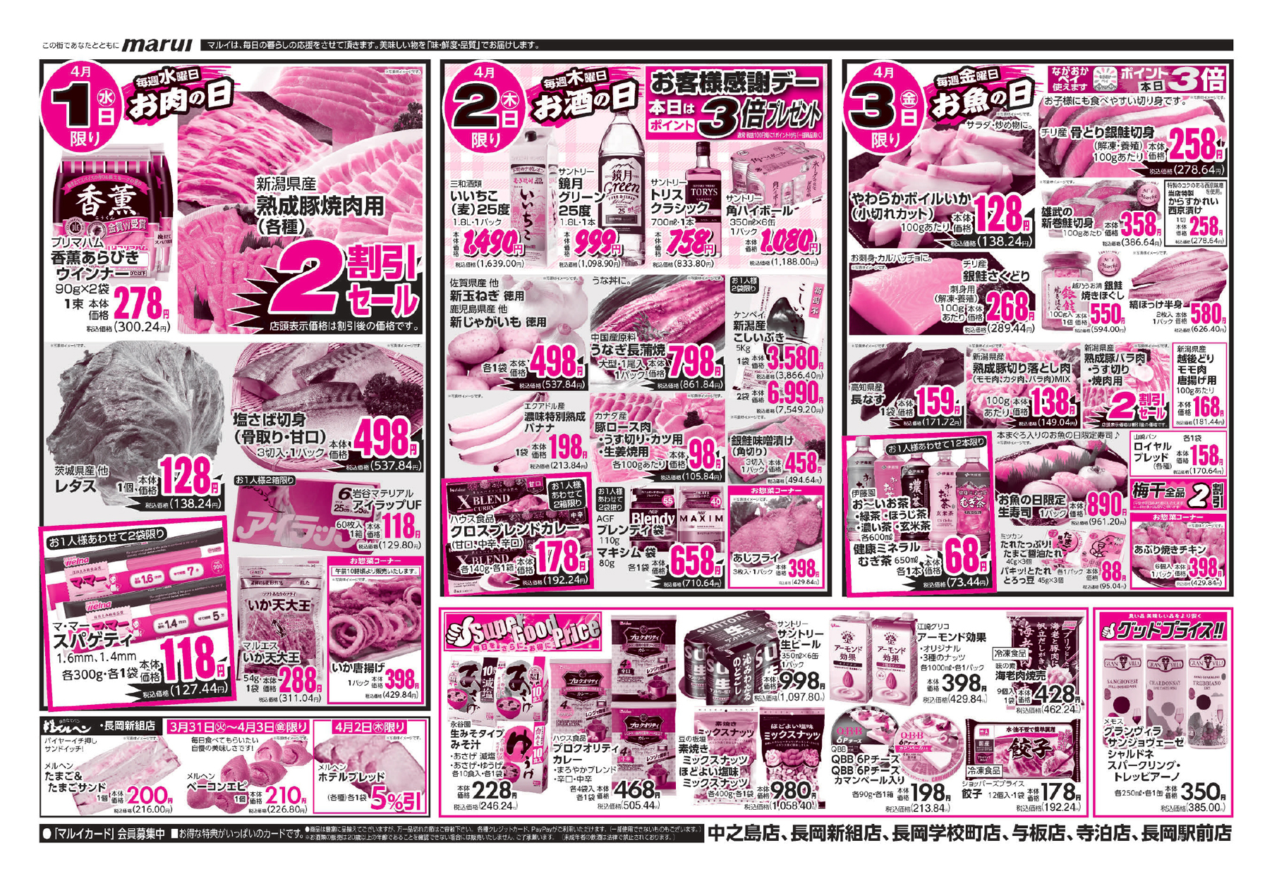 株式会社マルイ 【マルイチラシ】65SALE 掲載期間:2026年3月31日〜2026年4月3日 中越新潟市下越 スーパーマルイ 目次 各店 女池店・寺尾台店・小針店 中之島店・長岡新組店・長岡学校町店・与板店・寺泊店・長岡駅前店 各店 画像をクリックして拡大 prev next 女池店・寺尾台店・小針店 画像をクリックして拡大 prev next 中之島店・長岡新組店・長岡学校町店・与板店・寺泊店・長岡駅前店 画像をクリックして拡大 prev next セール・新店情報を見逃さない! ガタチラをホーム画面に追加して、 最新情報をすぐチェック▶追加方法はかんたん♪ 関連 ポイント3倍らて!