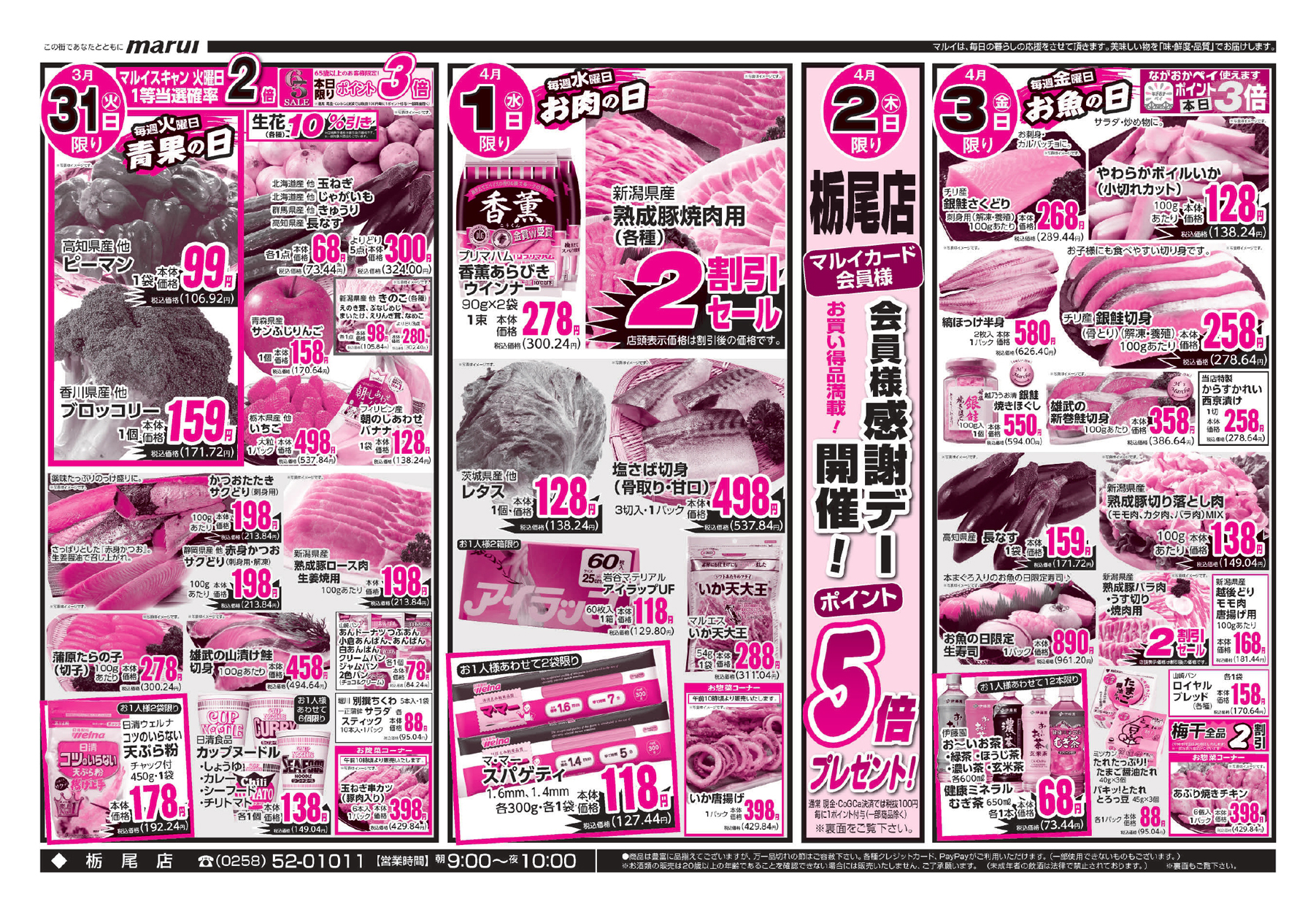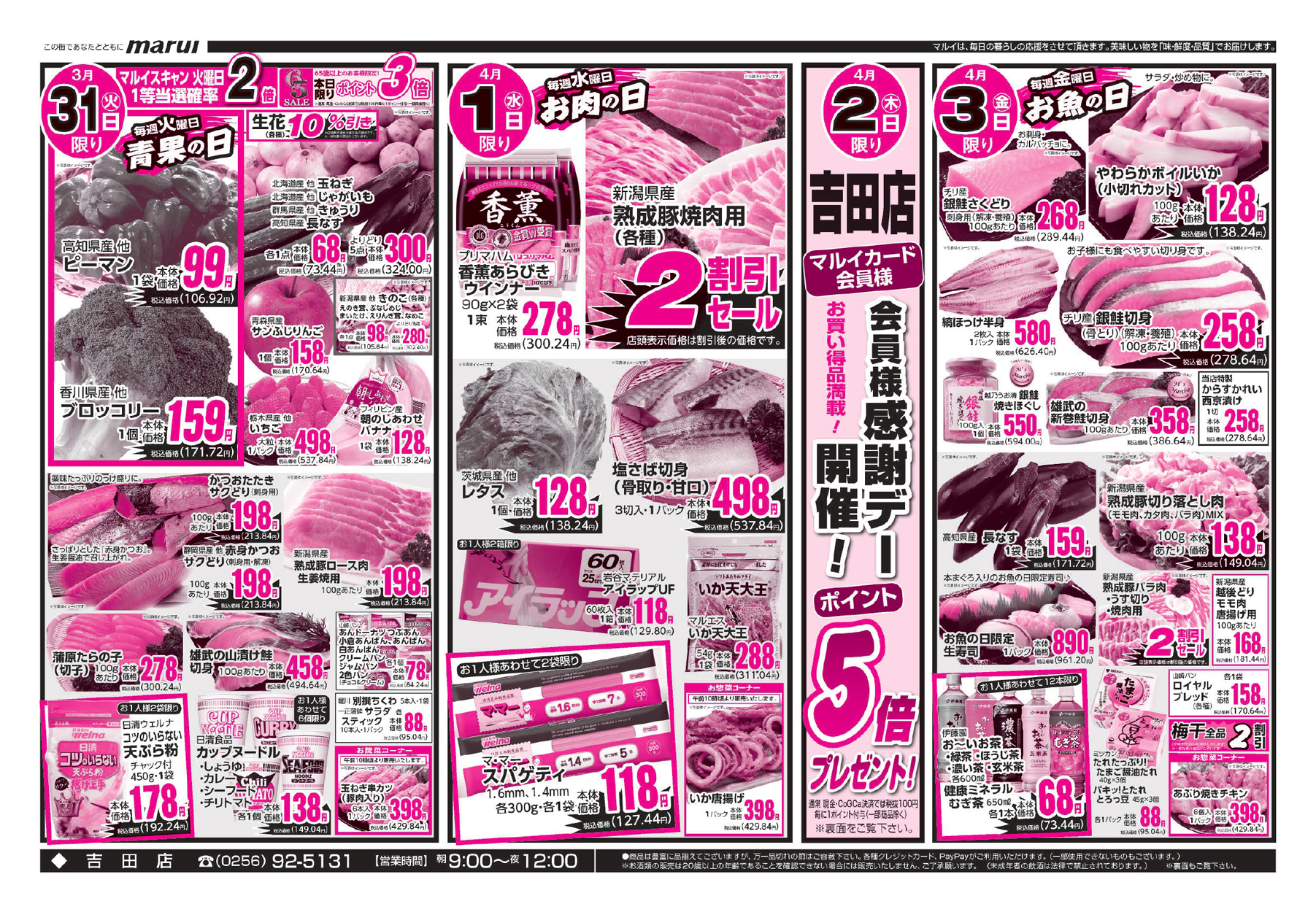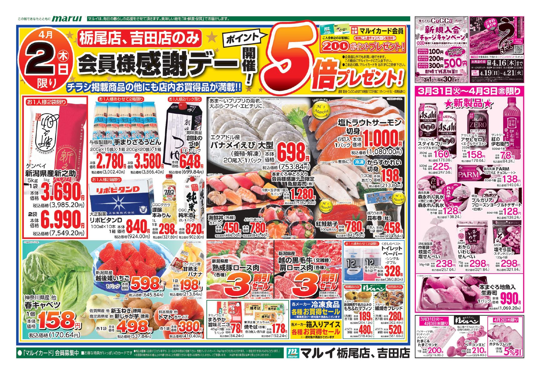株式会社マルイ 【マルイ吉田店・栃尾店チラシ】会員様感謝デー開催! 掲載期間:2026年3月31日〜2026年4月3日 中越下越 スーパーマルイ 目次 吉田店 栃尾店 吉田店 画像をクリックして拡大 prev next 栃尾店 画像をクリックして拡大 prev next セール・新店情報を見逃さない! ガタチラをホーム画面に追加して、 最新情報をすぐチェック▶追加方法はかんたん♪ 関連 ポイント5倍ですって!