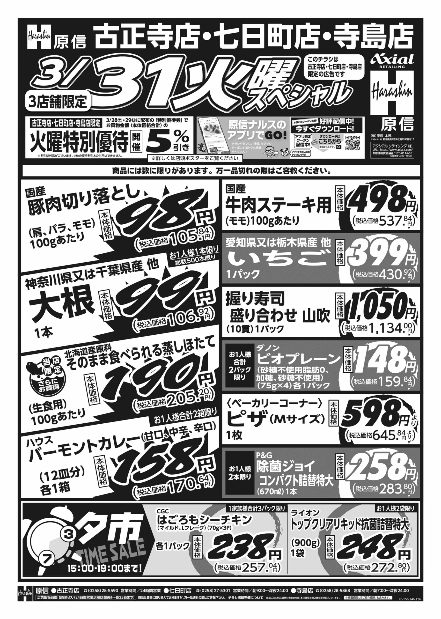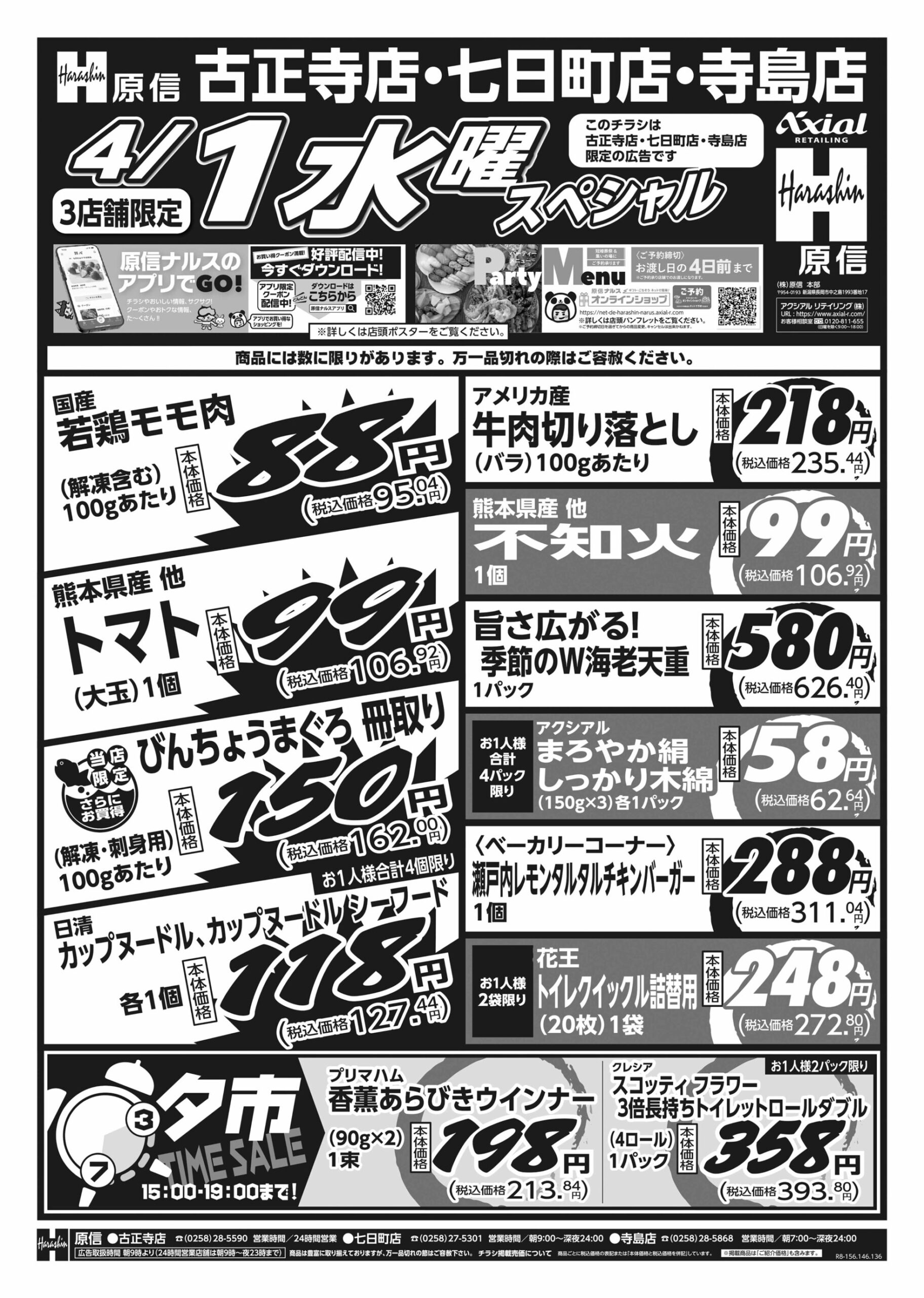 原信ナルス 【原信ナルス古正寺店・七日町店・寺島店チラシ】火曜スペシャル/水曜スペシャル 掲載期間:2026年3月31日〜2026年4月1日 中越 スーパー原信ナルス 画像をクリックして拡大 prev next 対象:古正寺店・七日町店・寺島店 セール・新店情報を見逃さない! ガタチラをホーム画面に追加して、 最新情報をすぐチェック▶追加方法はかんたん♪ 関連 大根がお買得ね♪