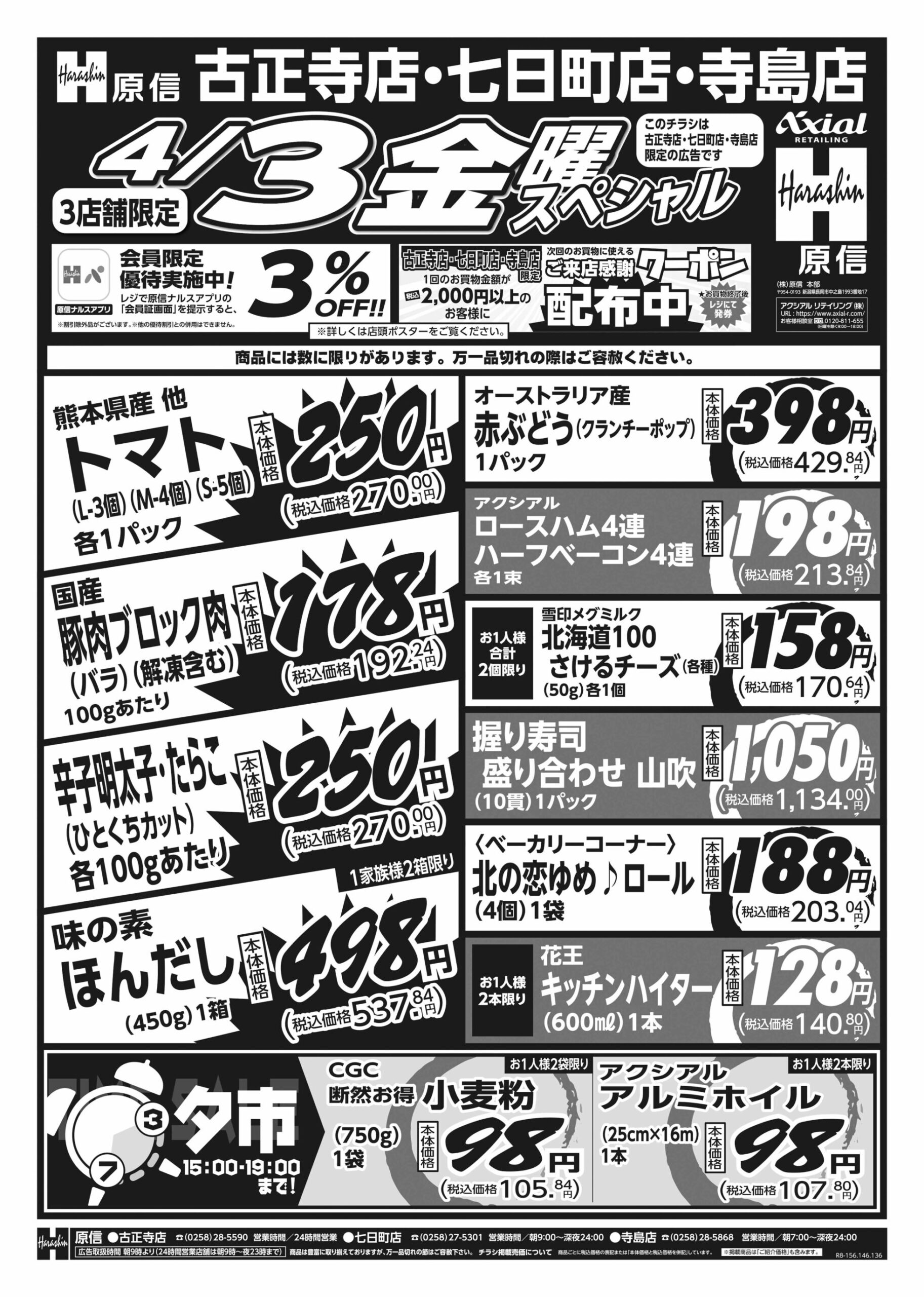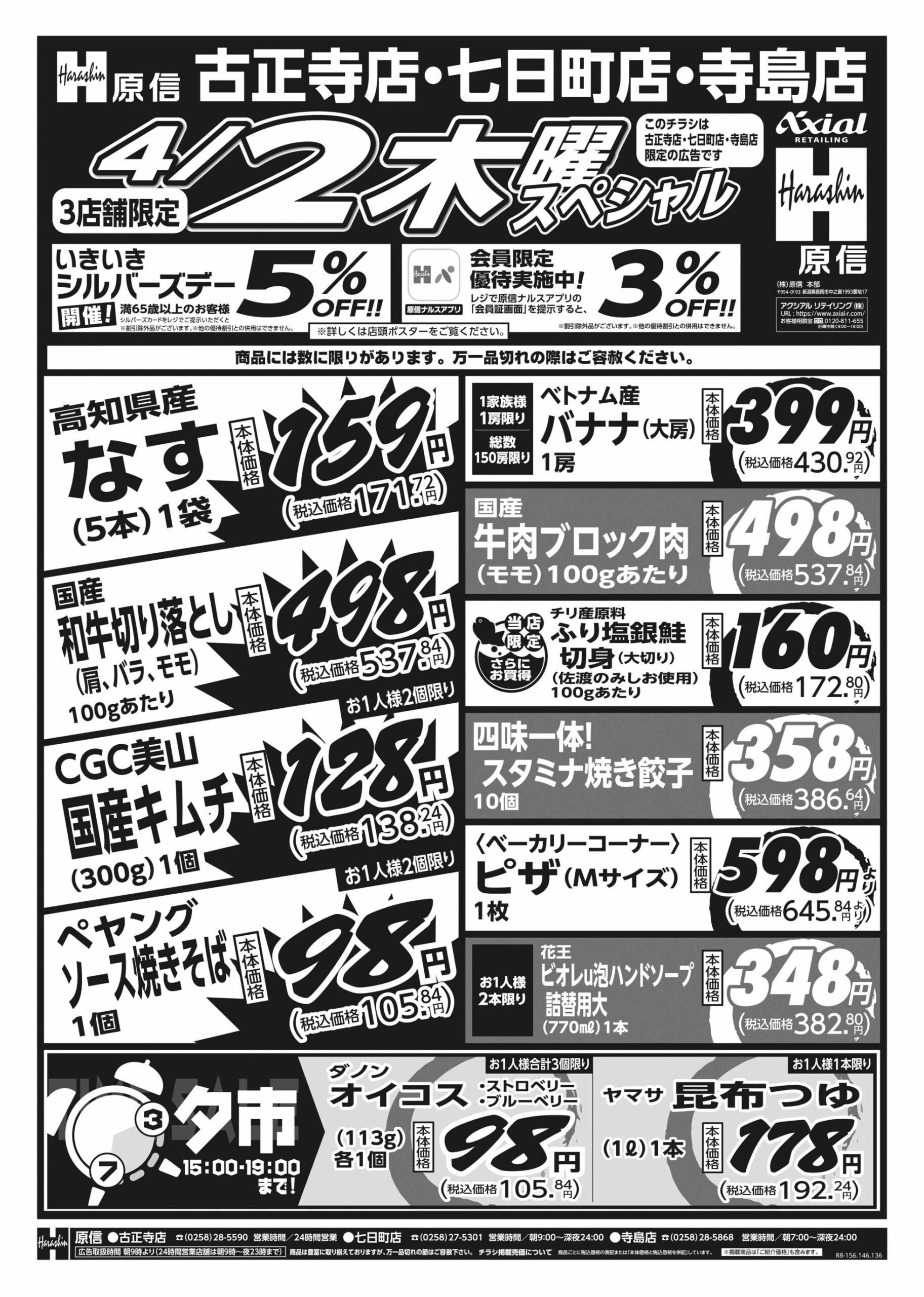 原信ナルス 【原信ナルス古正寺店・七日町店・寺島店チラシ】木曜スペシャル/金曜スペシャル 掲載期間:2026年4月2日〜2026年4月3日 中越 スーパー原信ナルス 画像をクリックして拡大 prev next 対象:古正寺店・七日町店・寺島店 セール・新店情報を見逃さない! ガタチラをホーム画面に追加して、 最新情報をすぐチェック▶追加方法はかんたん♪ 関連 なすがお買得だわ♪