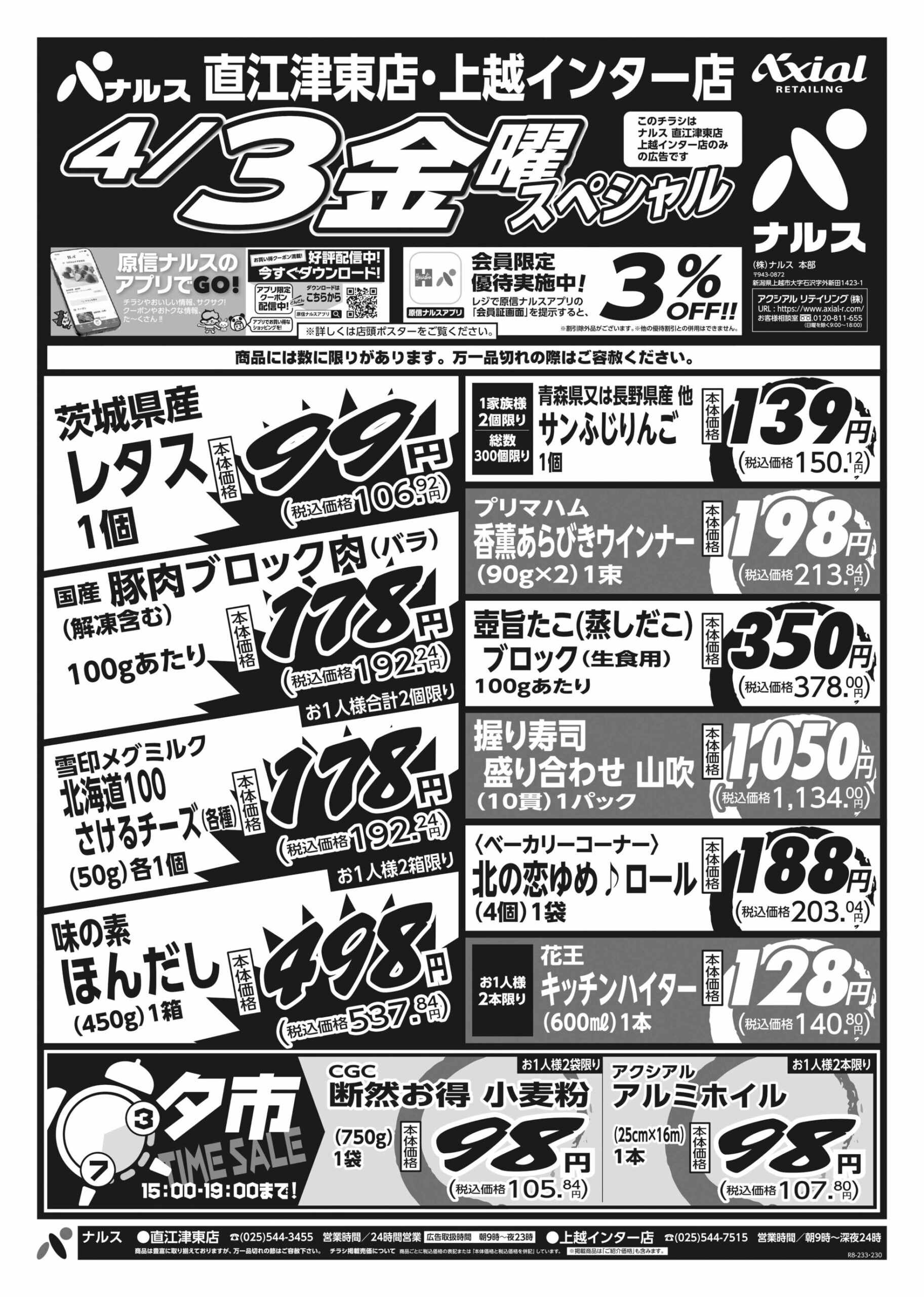 原信ナルス 【原信ナルス直江津東店・上越インター店チラシ】木曜スペシャル/金曜スペシャル 掲載期間:2026年4月2日〜2026年4月3日 上越 スーパー原信ナルス 画像をクリックして拡大 prev next 対象:直江津東店・上越インター店 セール・新店情報を見逃さない! ガタチラをホーム画面に追加して、 最新情報をすぐチェック▶追加方法はかんたん♪ 関連 トマトを買いに行きたいわ♪