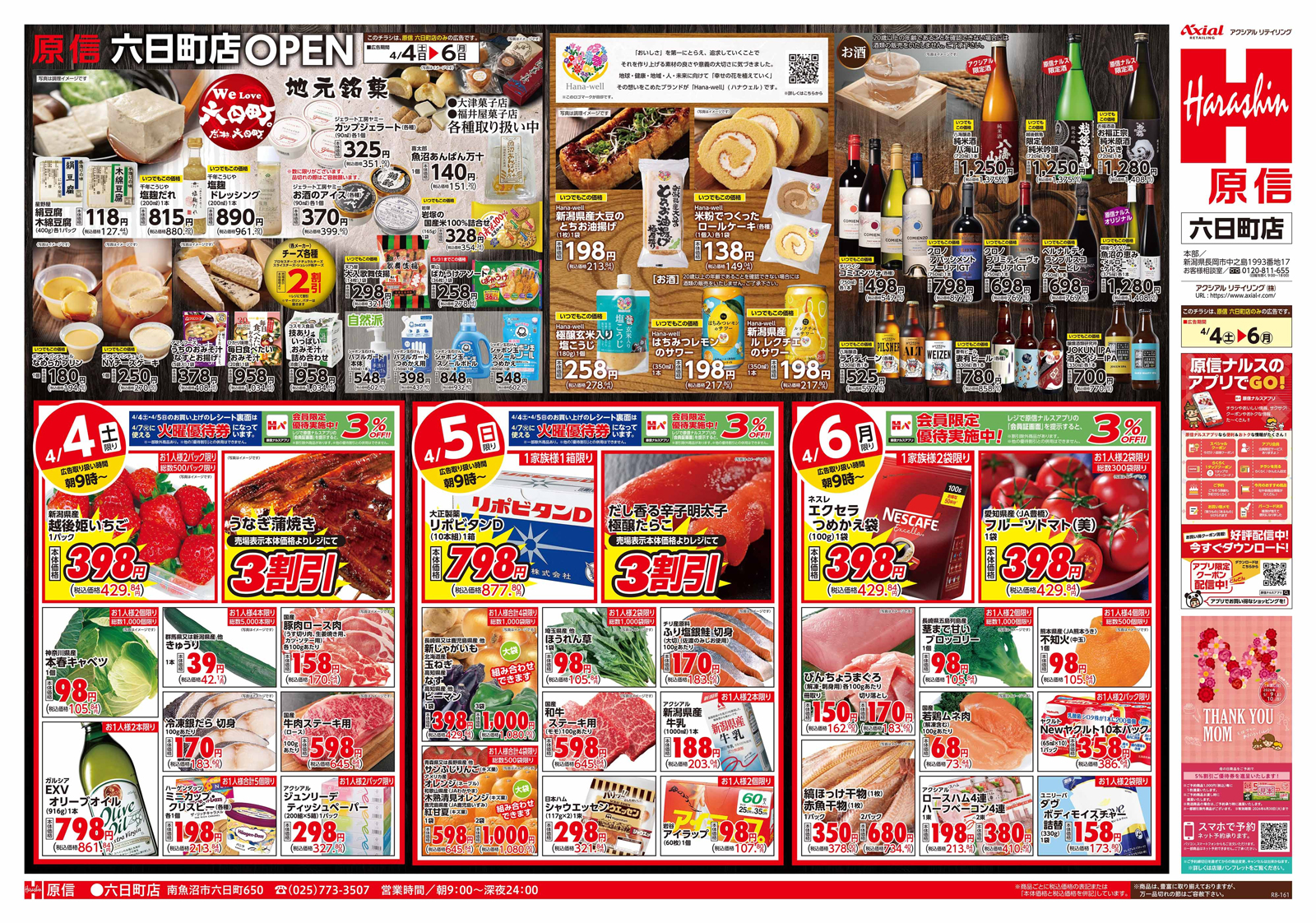 原信ナルス 【原信ナルス六日町店チラシ】OPEN 第5弾 掲載期間:2026年4月4日〜2026年4月6日 中越 スーパー原信ナルス 画像をクリックして拡大 prev next 対象:六日町店 セール・新店情報を見逃さない! ガタチラをホーム画面に追加して、 最新情報をすぐチェック▶追加方法はかんたん♪ 関連 紅ずわいがにおいしそうね~♪