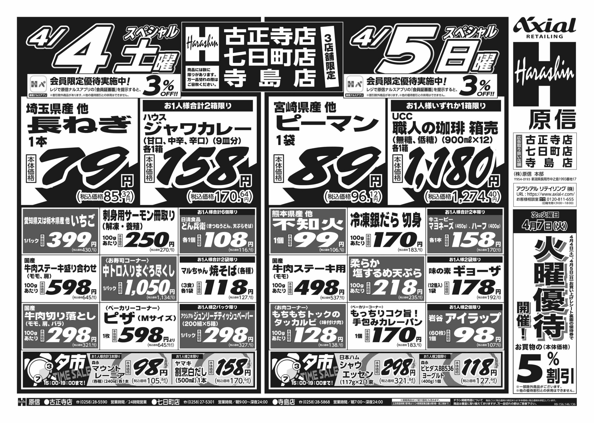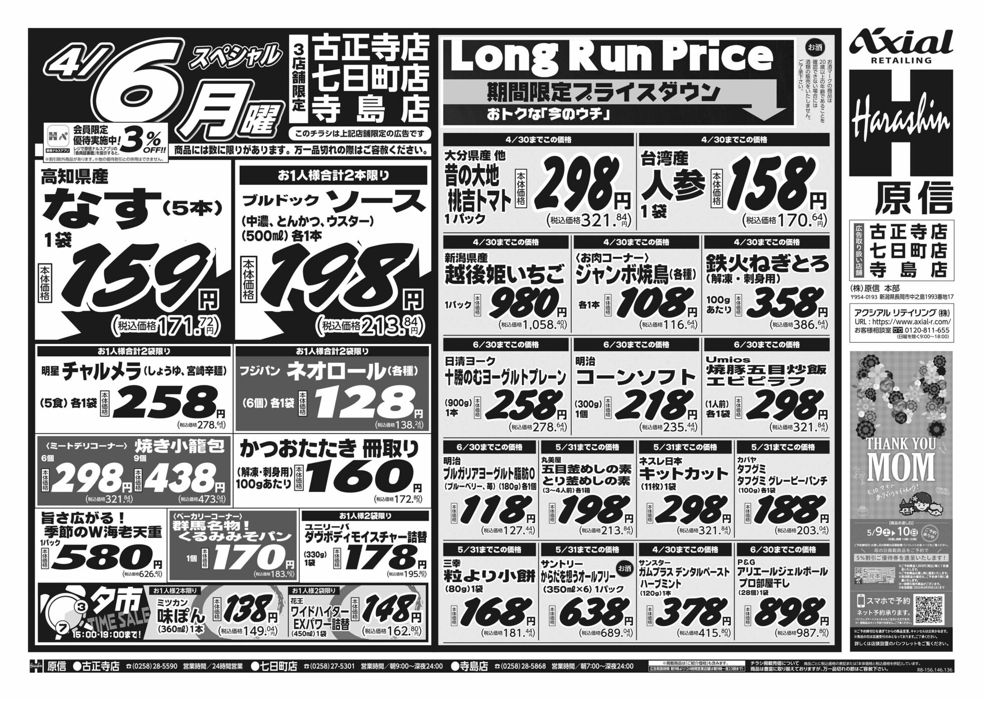 原信ナルス 【原信ナルス古正寺店・七日町店・寺島店チラシ】土曜スペシャル/日曜スペシャル/月曜スペシャル 掲載期間:2026年4月4日〜2026年4月6日 中越 スーパー原信ナルス 画像をクリックして拡大 prev next 対象:古正寺店・七日町店・寺島店 セール・新店情報を見逃さない! ガタチラをホーム画面に追加して、 最新情報をすぐチェック▶追加方法はかんたん♪ 関連 長ねぎほしいわ~♪