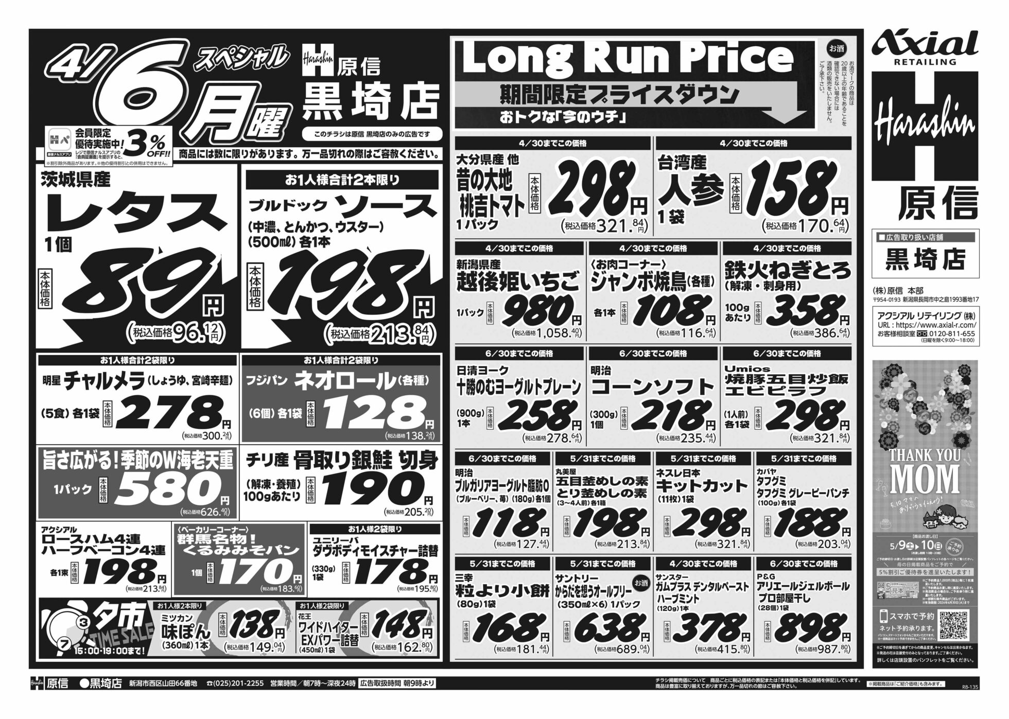 原信ナルス 【原信ナルス黒埼店チラシ】土曜スペシャル/日曜スペシャル/月曜スペシャル 掲載期間:2026年4月4日〜2026年4月6日 新潟市 スーパー原信ナルス 画像をクリックして拡大 prev next 対象:黒埼店 セール・新店情報を見逃さない! ガタチラをホーム画面に追加して、 最新情報をすぐチェック▶追加方法はかんたん♪ 関連 ピーマンがお買得だわ♪