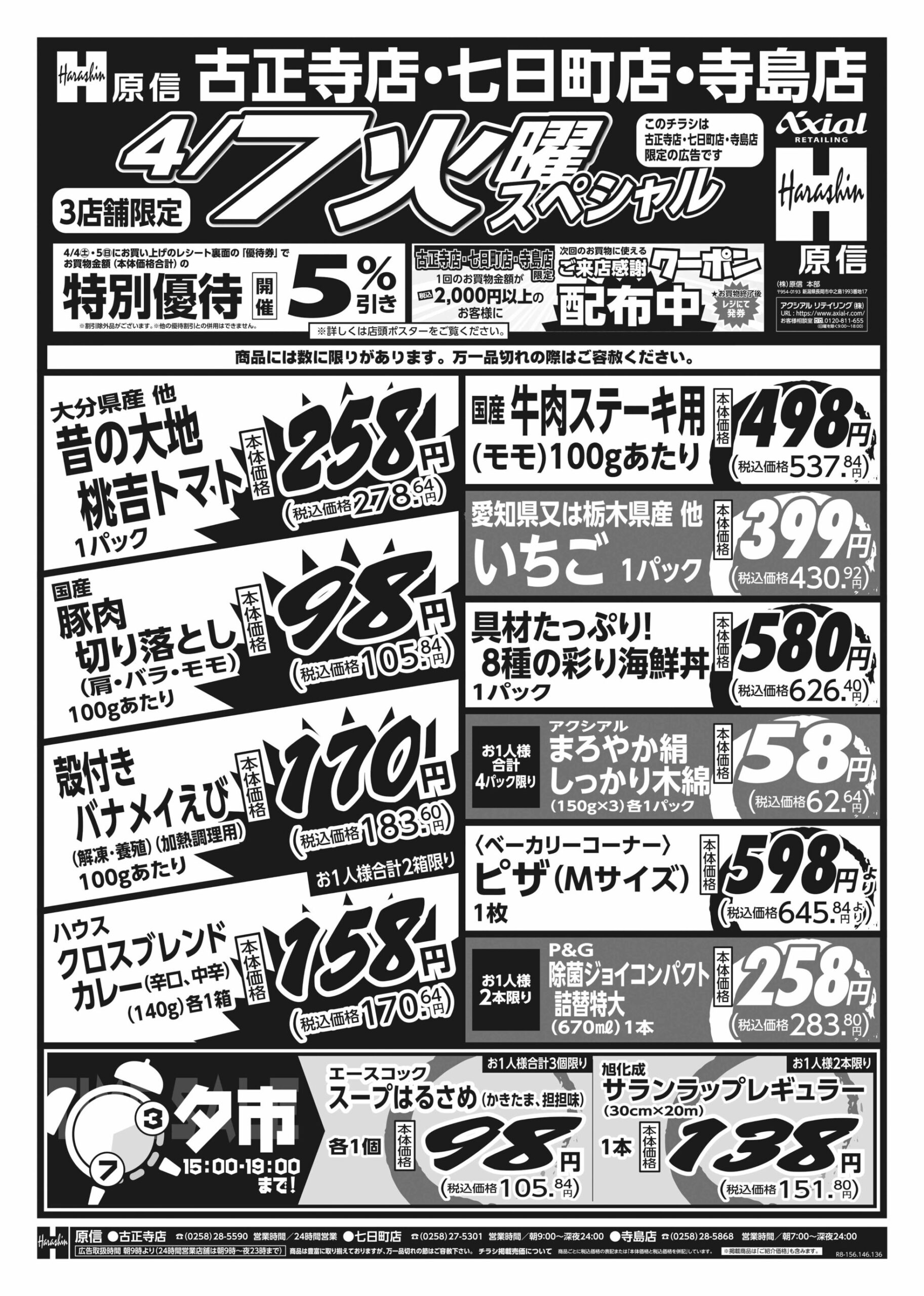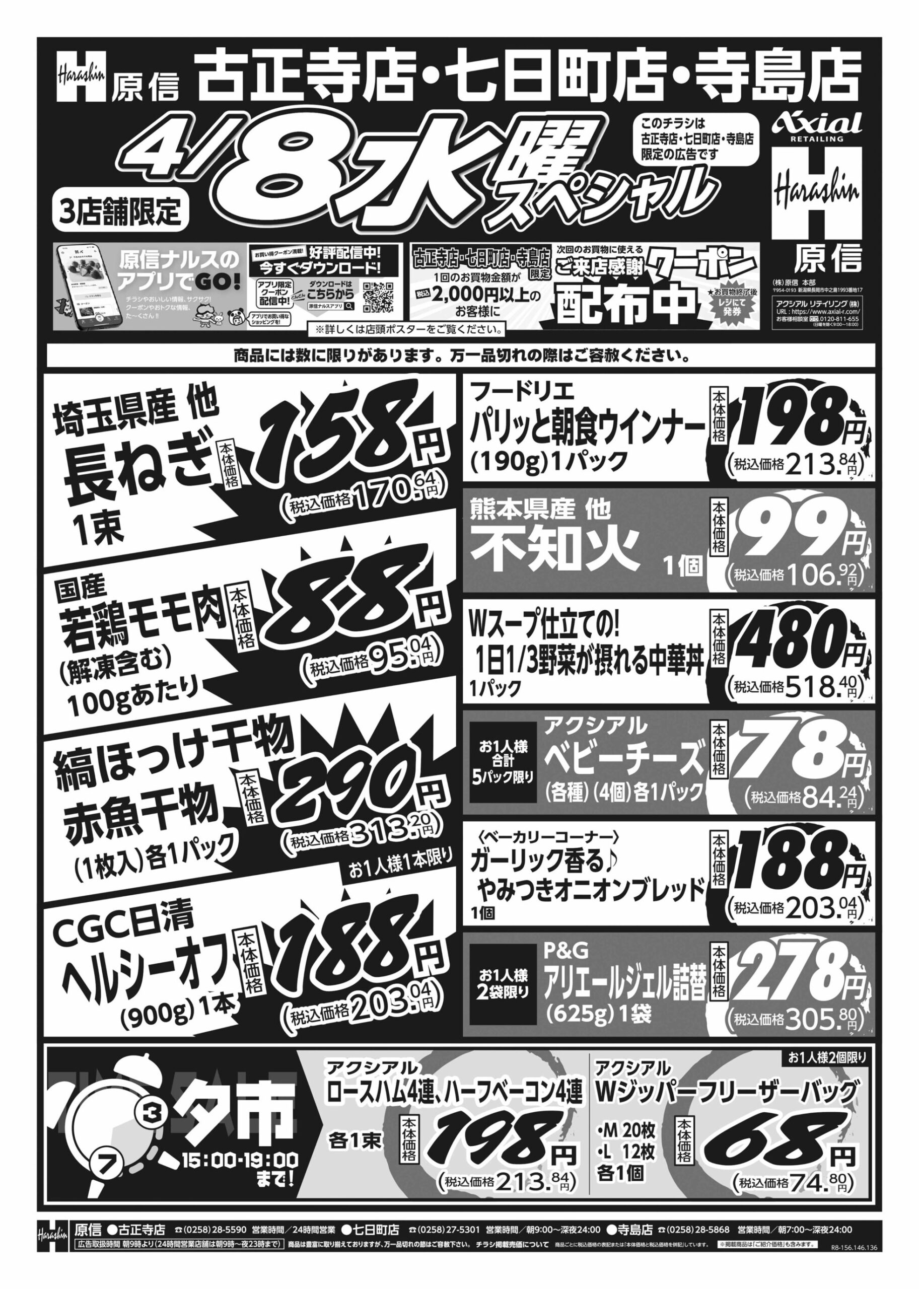 原信ナルス 【原信ナルス古正寺店・七日町店・寺島店チラシ】火曜スペシャル/水曜スペシャル 掲載期間:2026年4月7日〜2026年4月8日 中越 スーパー原信ナルス 画像をクリックして拡大 prev next 対象:古正寺店・七日町店・寺島店 セール・新店情報を見逃さない! ガタチラをホーム画面に追加して、 最新情報をすぐチェック▶追加方法はかんたん♪ 関連 8種の彩り海鮮丼、おいしそうね!