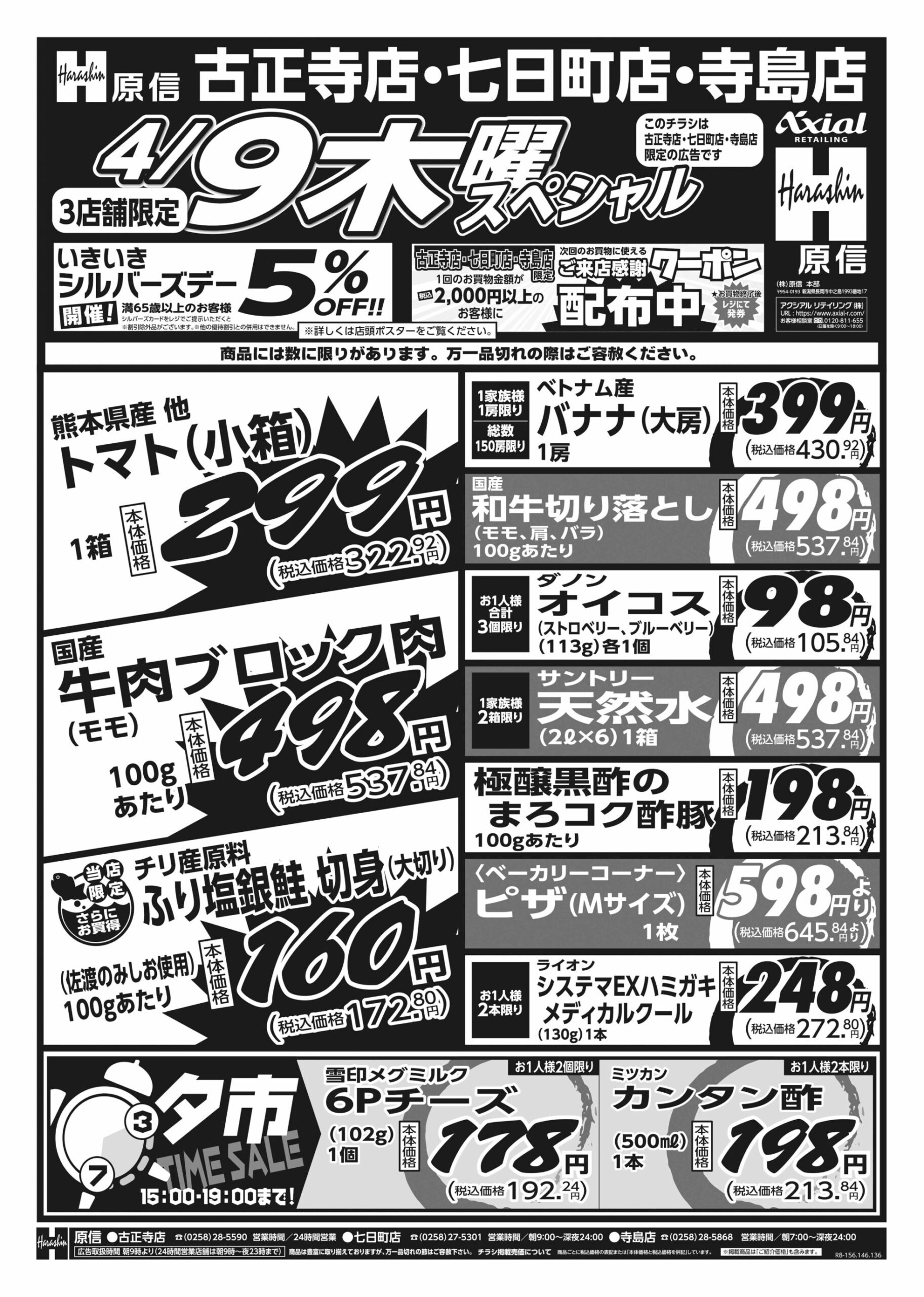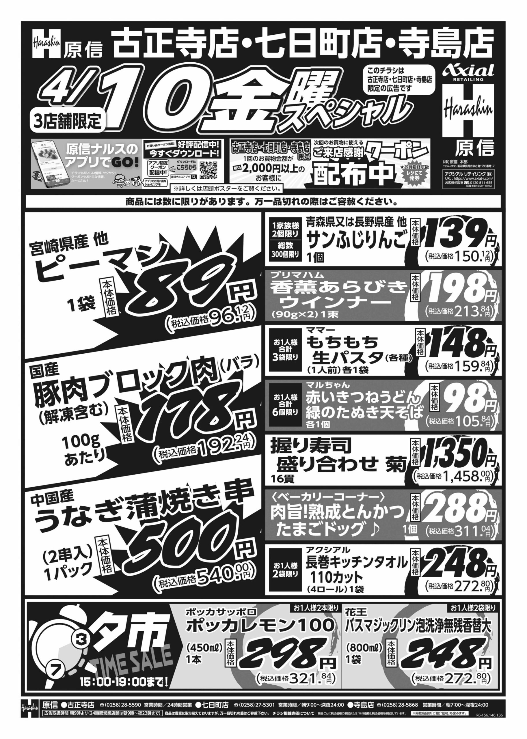 原信ナルス 【原信ナルス古正寺店・七日町店・寺島店チラシ】木曜スペシャル/金曜スペシャル 掲載期間:2026年4月9日〜2026年4月10日 中越 スーパー原信ナルス 画像をクリックして拡大 prev next 対象:古正寺店・七日町店・寺島店 セール・新店情報を見逃さない! ガタチラをホーム画面に追加して、 最新情報をすぐチェック▶追加方法はかんたん♪ 関連 トマトがお買い得ね!