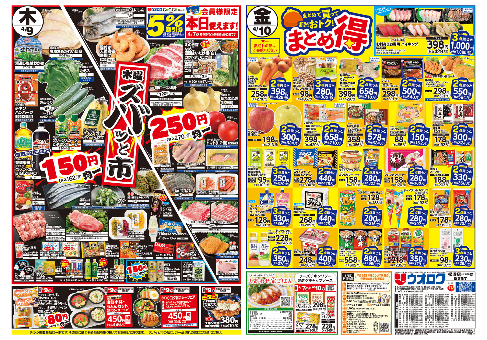 ウオロク 【ウオロクチラシ】木曜ズバッと市 掲載期間:2026年4月7日〜2026年4月10日 上越中越新潟市下越 スーパーウオロク 画像をクリックして拡大 prev next セール・新店情報を見逃さない! ガタチラをホーム画面に追加して、 最新情報をすぐチェック▶追加方法はかんたん♪ 関連 お買い得品が満載ね! 金曜日はまとめ買いがお得ですって!