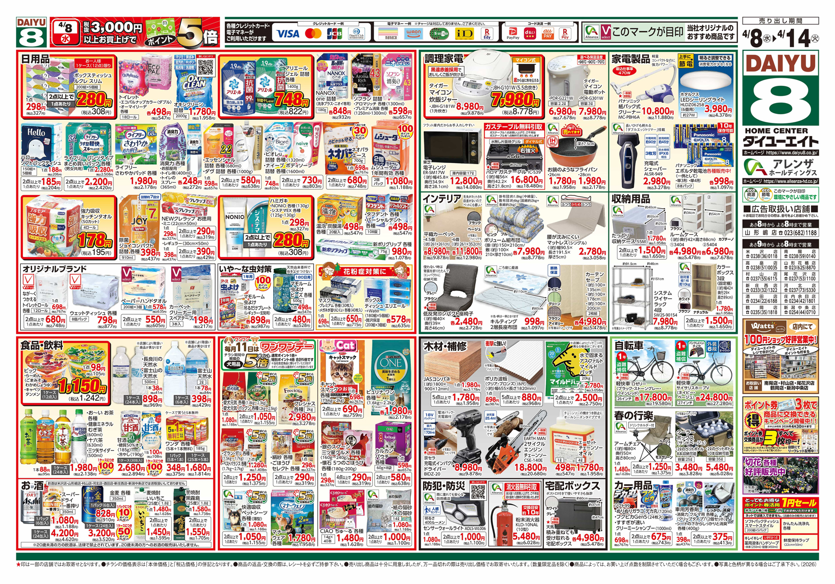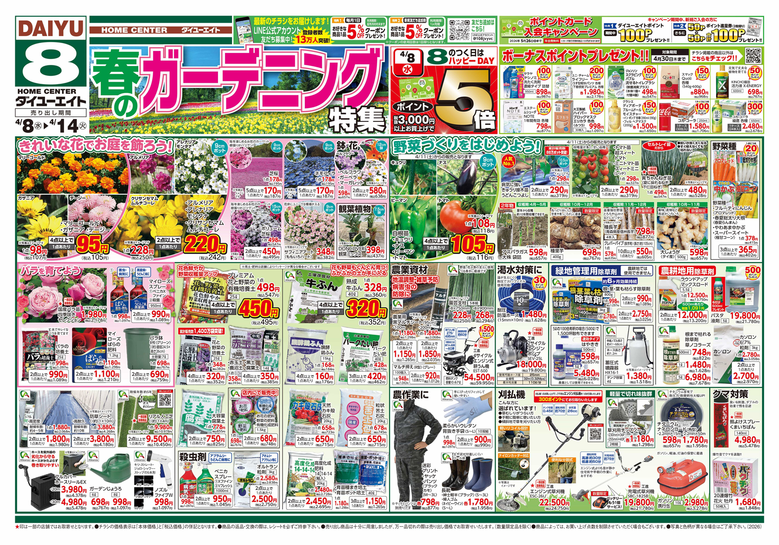 ダイユーエイト 【ダイユーエイトチラシ】春のガーデニング特集 掲載期間:2026年4月8日〜2026年4月14日 下越 ホームセンター 画像をクリックして拡大 prev next セール・新店情報を見逃さない! ガタチラをホーム画面に追加して、 最新情報をすぐチェック▶追加方法はかんたん♪ 関連 花や野菜の苗を選ぶのはワクワクするわね♪