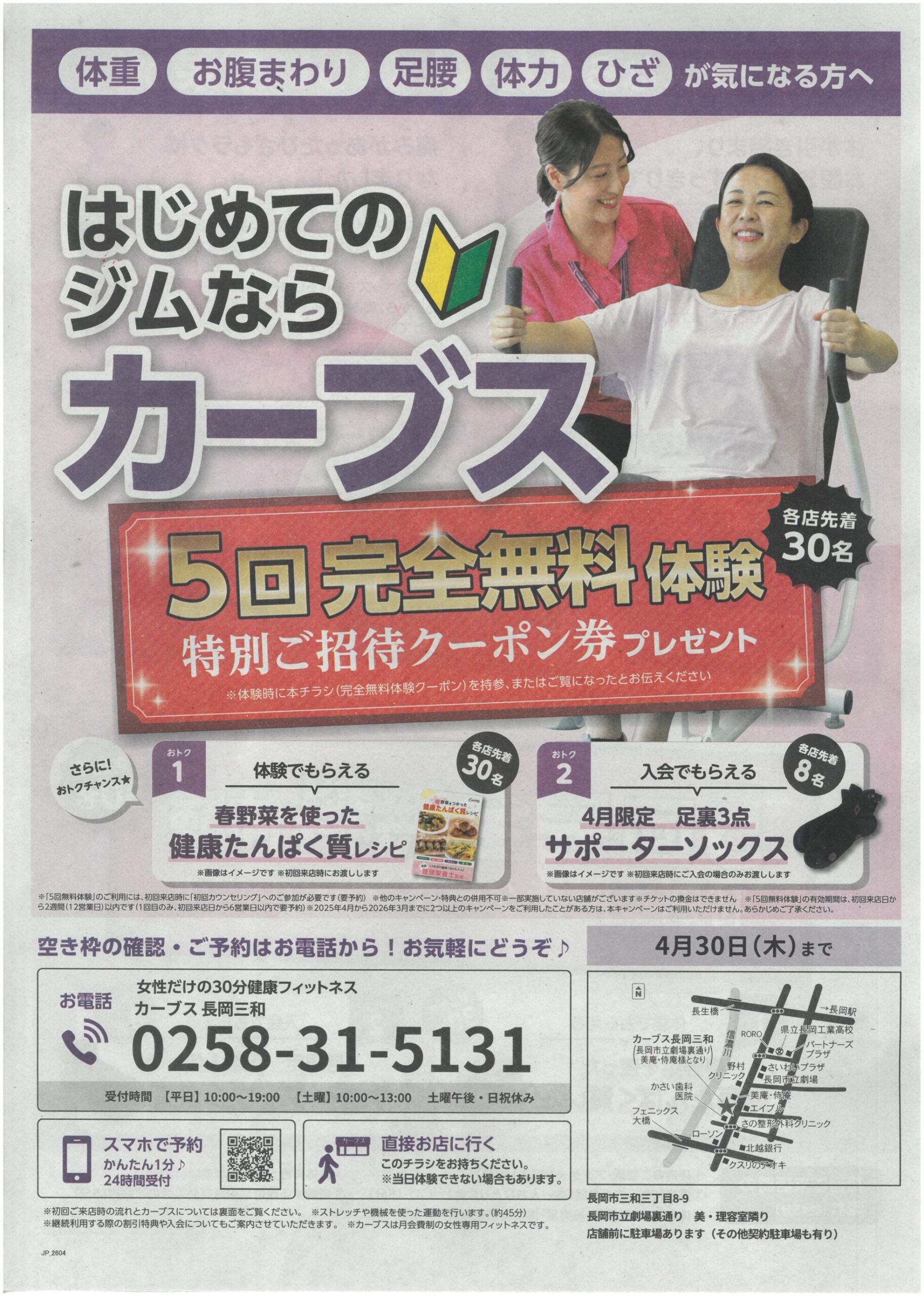 カーブス長岡三和 【カーブス長岡三和チラシ】はじめてのジムならカーブス 掲載期間:2026年4月7日〜2026年4月30日 中越 スポーツジム 画像をクリックして拡大 prev next セール・新店情報を見逃さない! ガタチラをホーム画面に追加して、 最新情報をすぐチェック▶追加方法はかんたん♪ 関連 プレゼントもうれしいわね♪