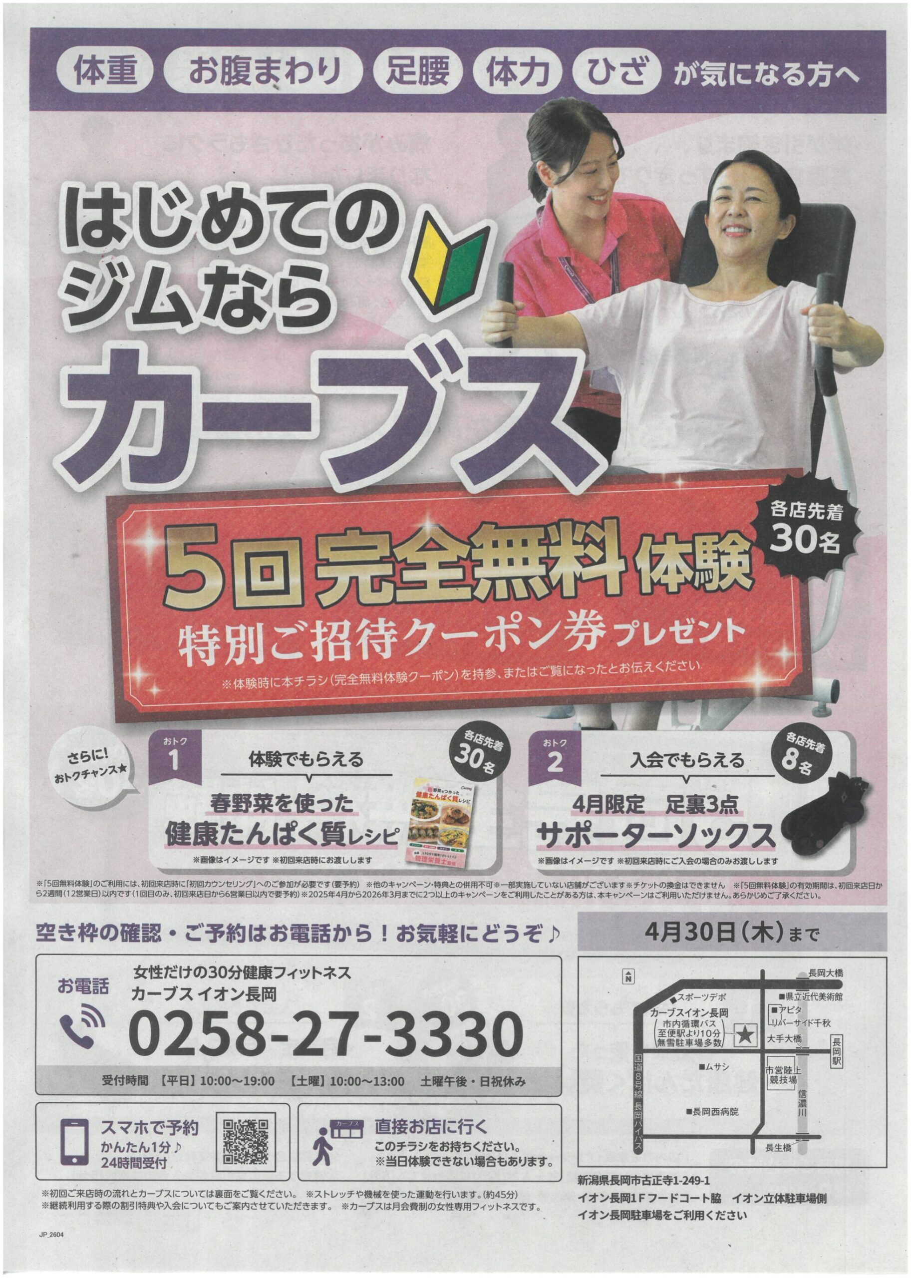 カーブスイオン長岡 【カーブスイオン長岡チラシ】はじめてのジムならカーブス 掲載期間:2026年4月9日〜2026年4月30日 中越 スポーツジム 画像をクリックして拡大 prev next セール・新店情報を見逃さない! ガタチラをホーム画面に追加して、 最新情報をすぐチェック▶追加方法はかんたん♪ 関連 健康たんぱく質レシピ気になるわ~♪