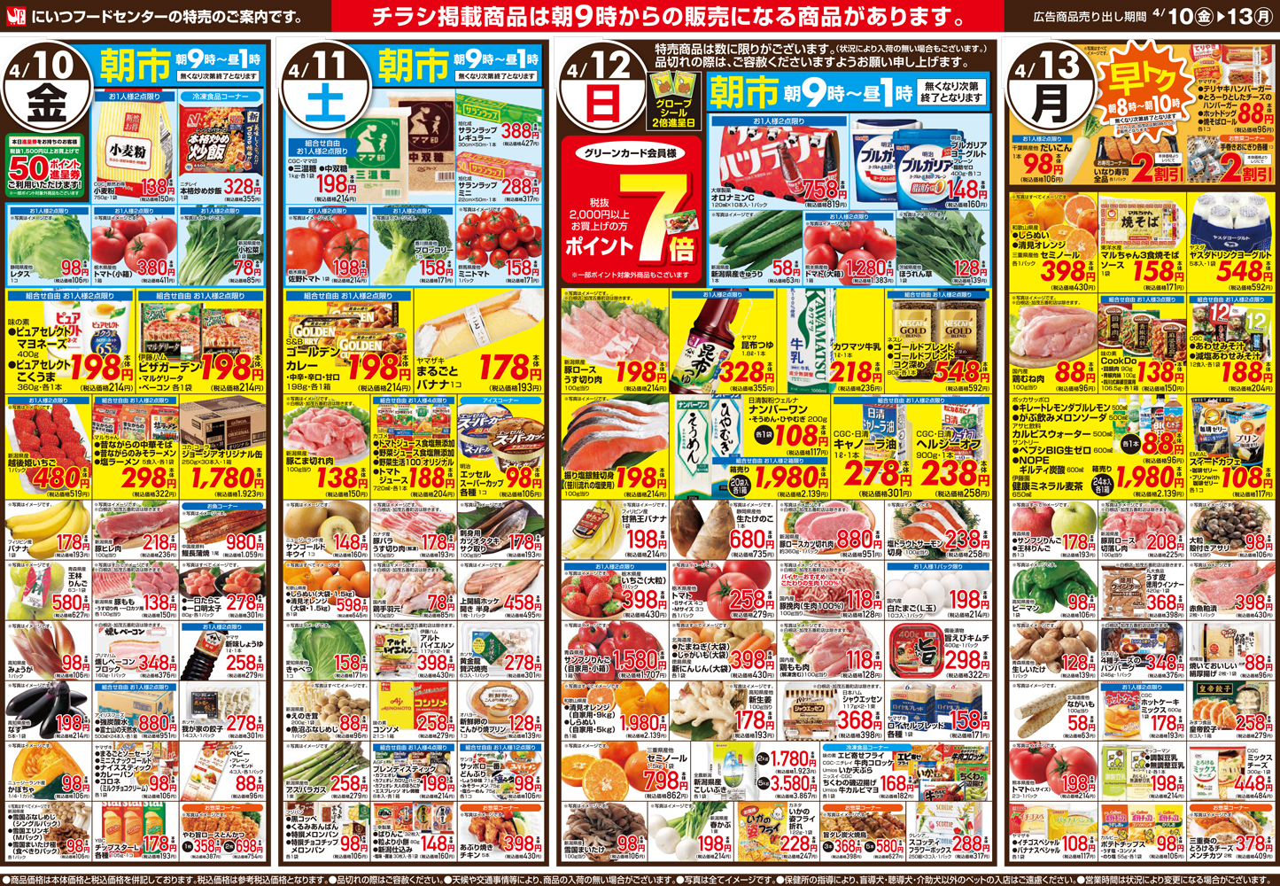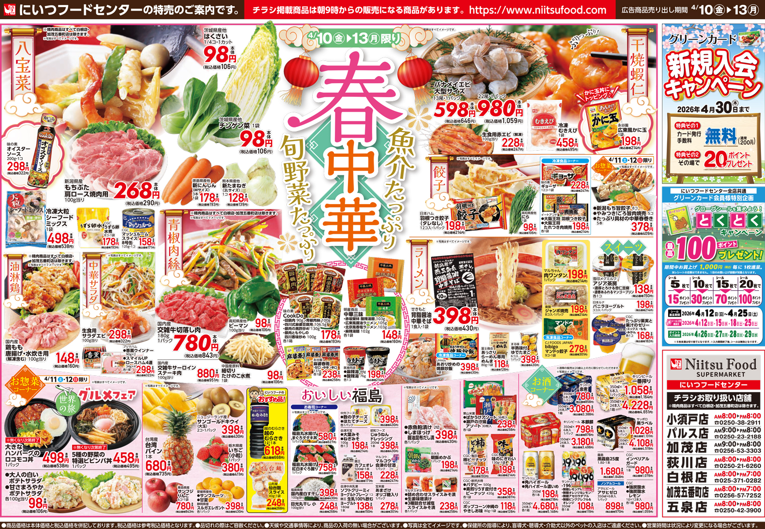 にいつフードセンター 【にいつフードセンターチラシ】春中華 掲載期間:2026年4月10日〜2026年4月13日 にいつフードセンター 画像をクリックして拡大 prev next セール・新店情報を見逃さない! ガタチラをホーム画面に追加して、 最新情報をすぐチェック▶追加方法はかんたん♪ 関連 冷凍食品や中華料理の素を使えば、簡単においしい中華が食べられるわね!