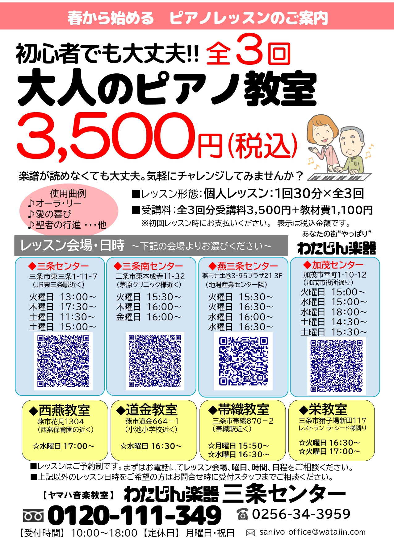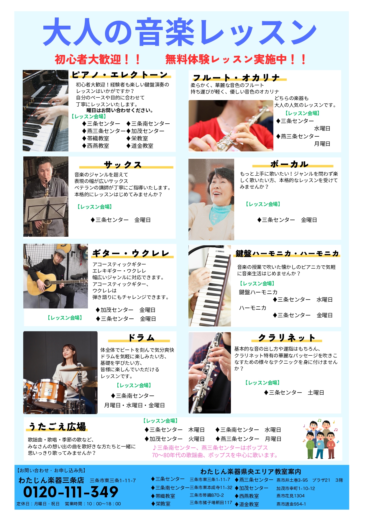 【わたじん楽器三条センターチラシ】大人のピアノ教室/大人の音楽レッスン