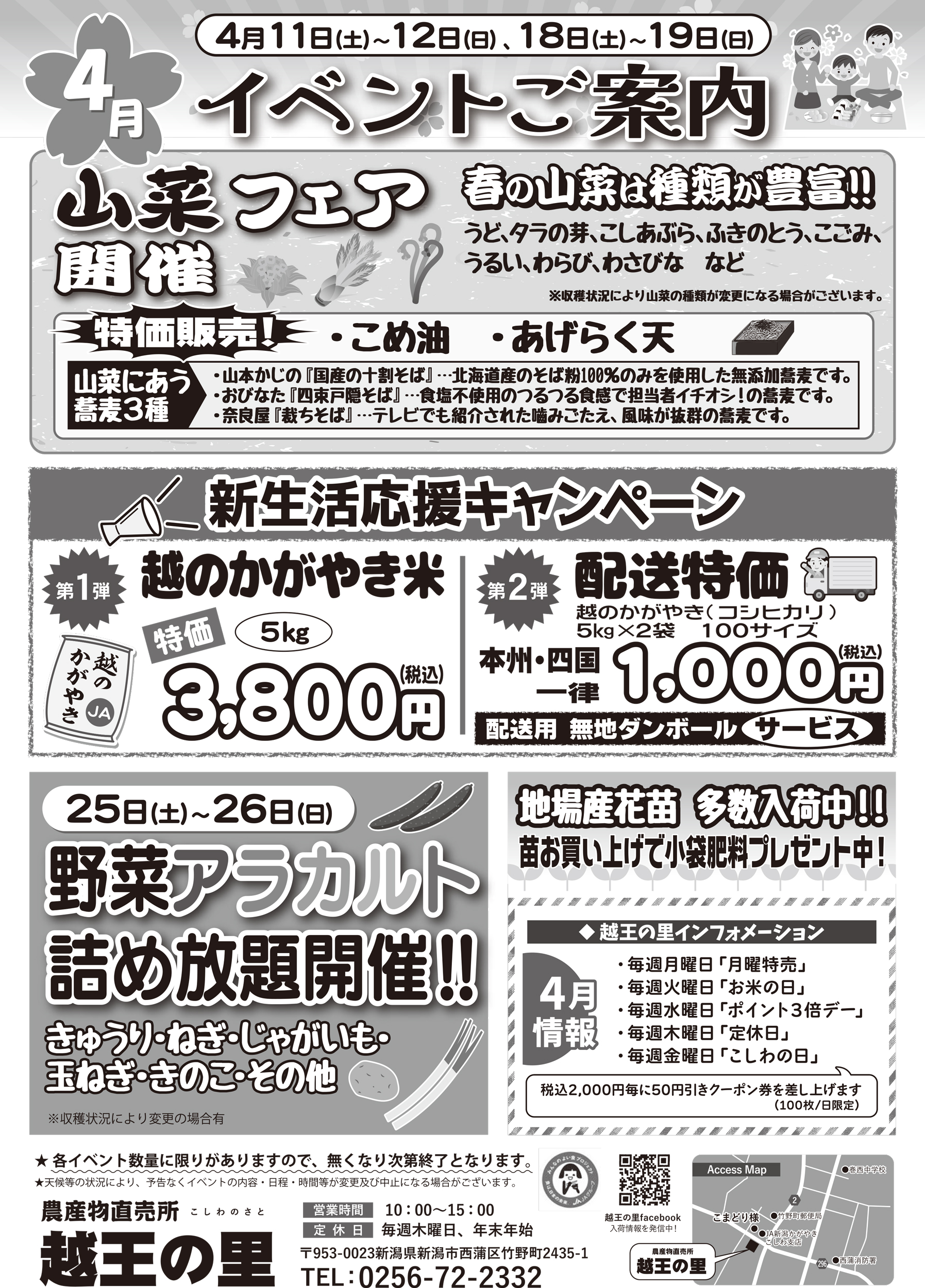 JA新潟かがやき 【越王の里チラシ】イベントご案内 掲載期間:2026年4月11日〜2026年4月30日 新潟市 生活サービス 画像をクリックして拡大 prev next セール・新店情報を見逃さない! ガタチラをホーム画面に追加して、 最新情報をすぐチェック▶追加方法はかんたん♪ 関連 山菜の時期ね! 天ぷらにして食べたいわ♪