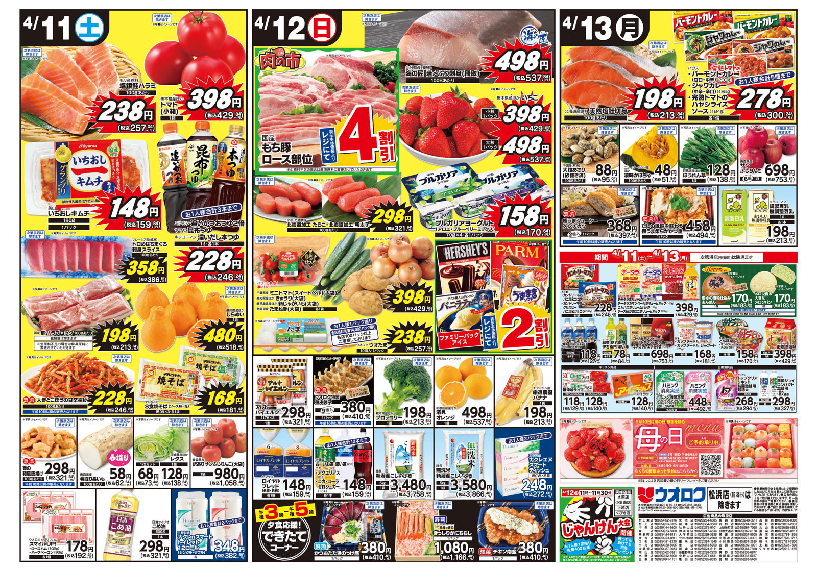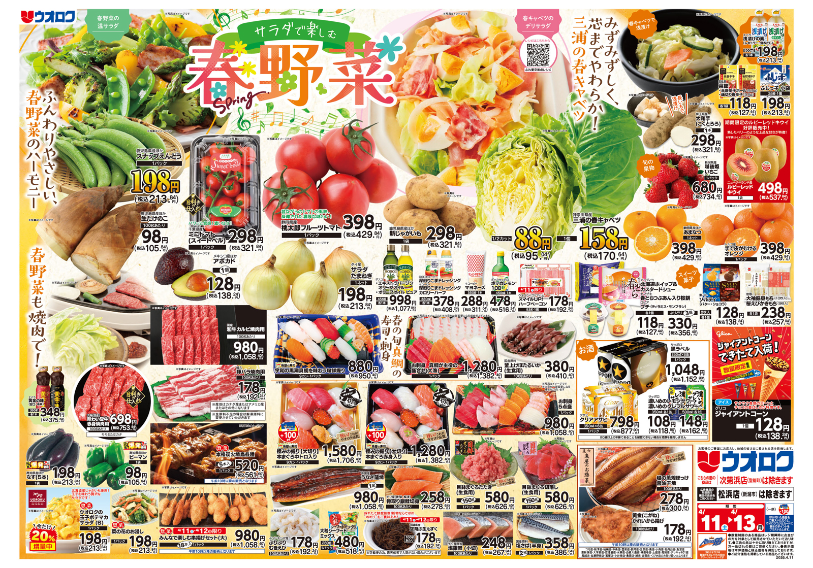 ウオロク 【ウオロクチラシ】サラダで楽しむ春野菜 掲載期間:2026年4月11日〜2026年4月13日 上越中越新潟市下越 スーパーウオロク 画像をクリックして拡大 prev next 対象:松浜店除く セール・新店情報を見逃さない! ガタチラをホーム画面に追加して、 最新情報をすぐチェック▶追加方法はかんたん♪ 関連 春野菜は素材の味を楽しみたいわね!