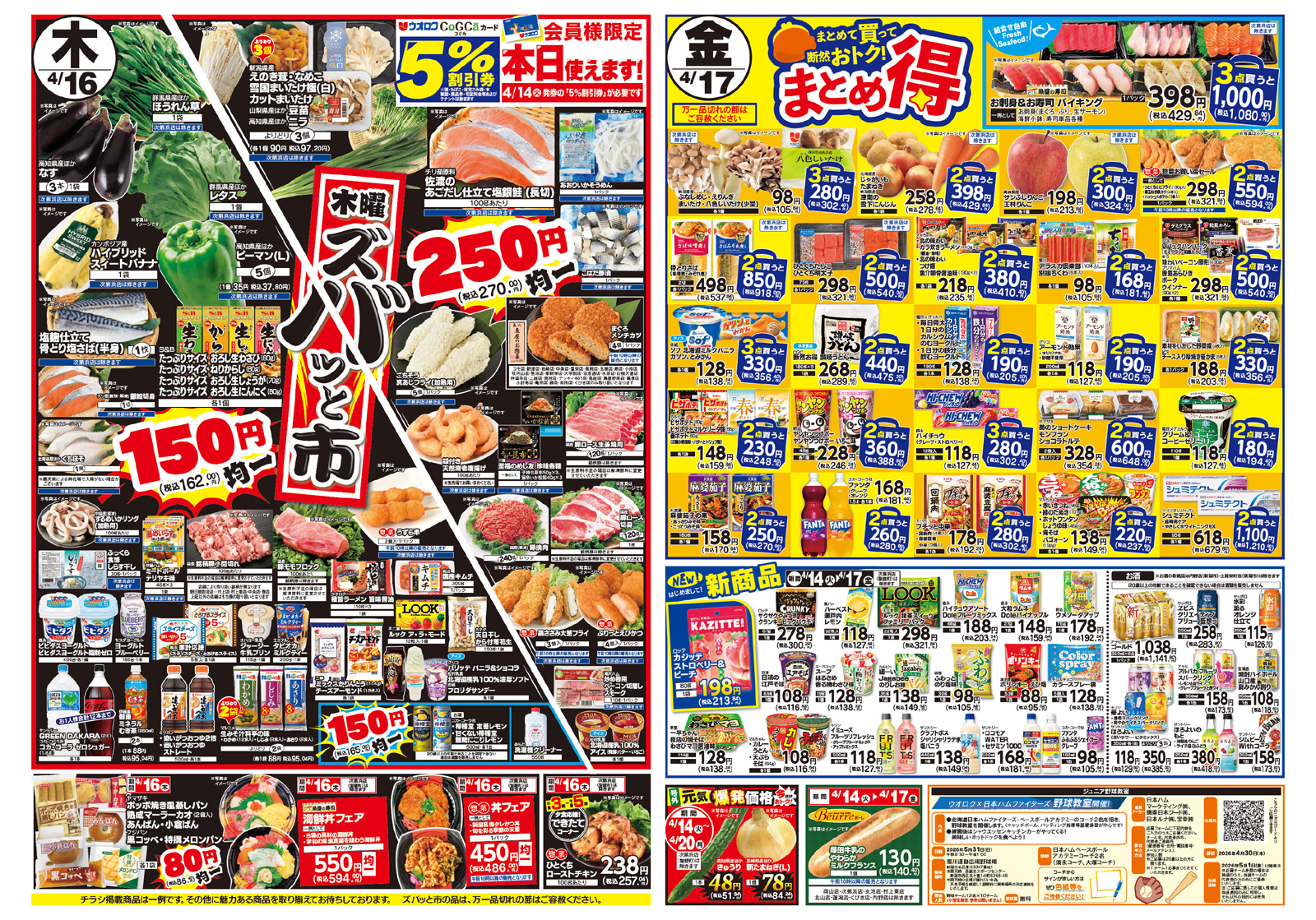 ウオロク 【ウオロクチラシ】木曜ズバッと市 掲載期間:2026年4月14日〜2026年4月17日 上越中越新潟市下越 スーパーウオロク 画像をクリックして拡大 prev next 対象:各店 セール・新店情報を見逃さない! ガタチラをホーム画面に追加して、 最新情報をすぐチェック▶追加方法はかんたん♪ 関連 お買い得品がたくさんね!