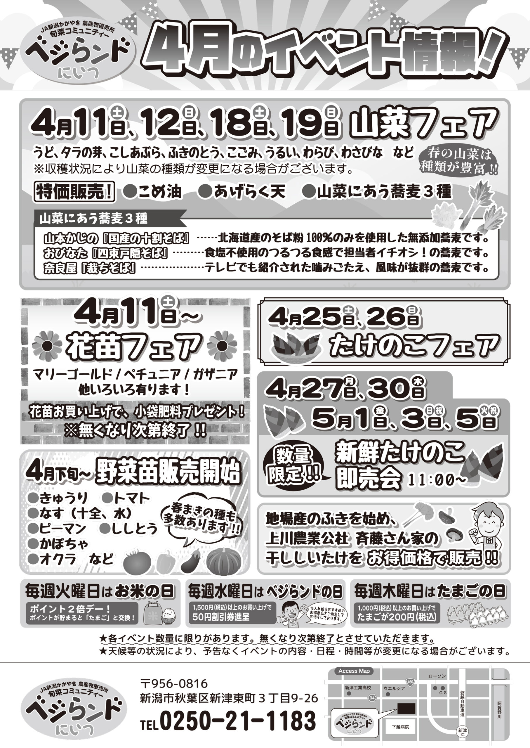 JA新潟かがやき 【ベジらンドにいつチラシ】4月のイベント情報! 掲載期間:2026年4月11日〜2026年4月30日 新潟市 生活サービス 画像をクリックして拡大 prev next セール・新店情報を見逃さない! ガタチラをホーム画面に追加して、 最新情報をすぐチェック▶追加方法はかんたん♪ 関連 新鮮なたけのこで「たけのこごはん」にしたいわね!