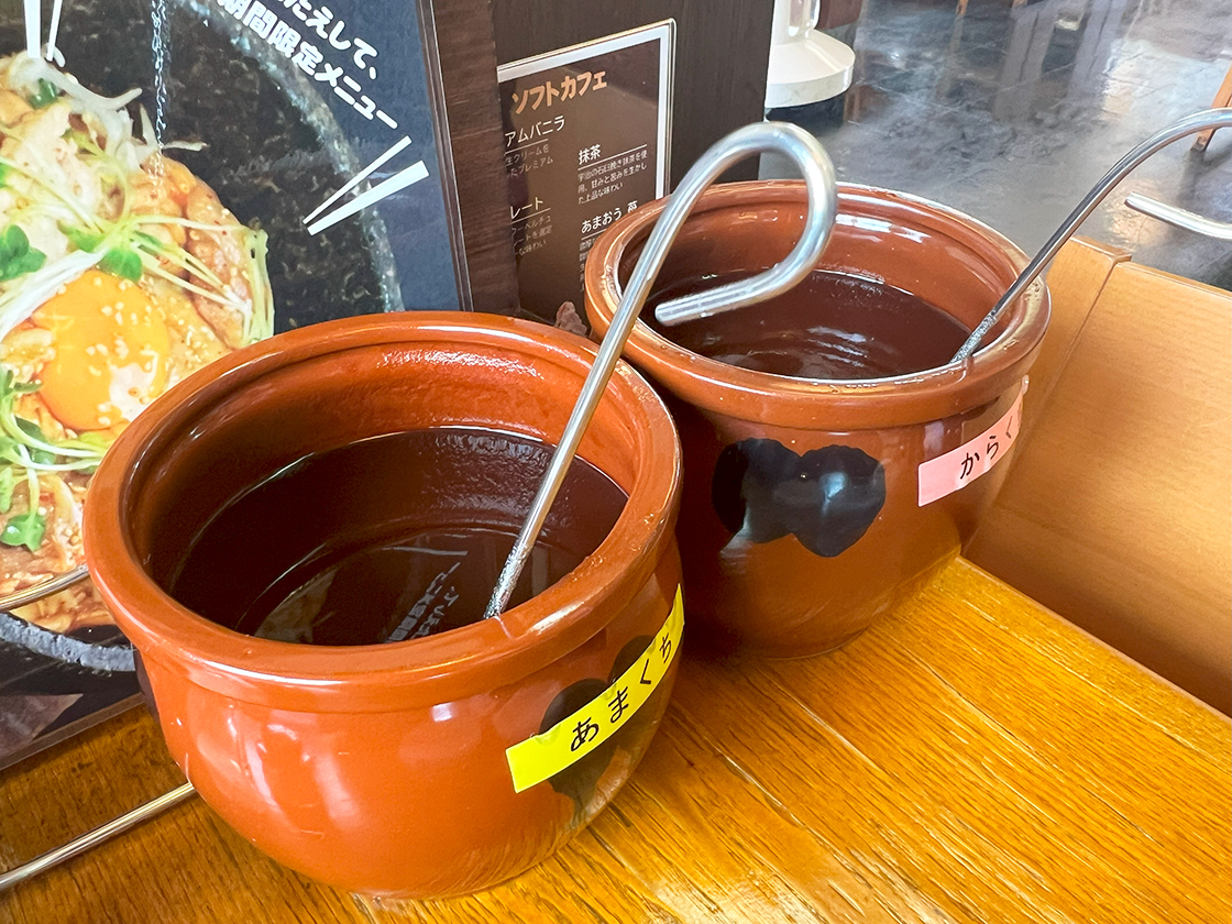 卓上には、「あまくちソース」と「からくちソース」が用意されているので、食べ比べも楽しめますよ♪
