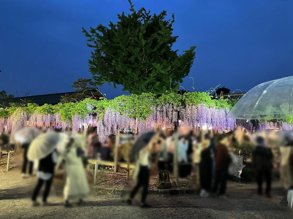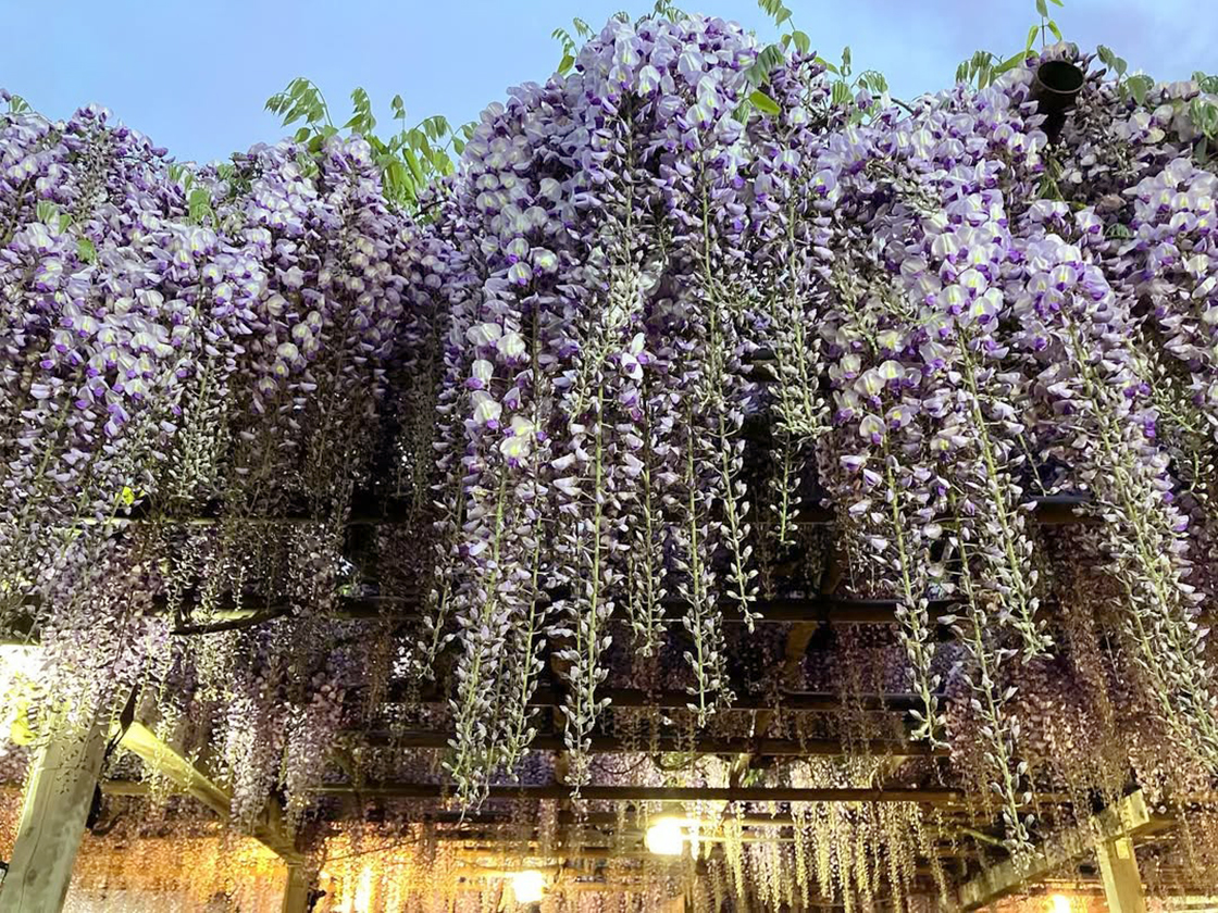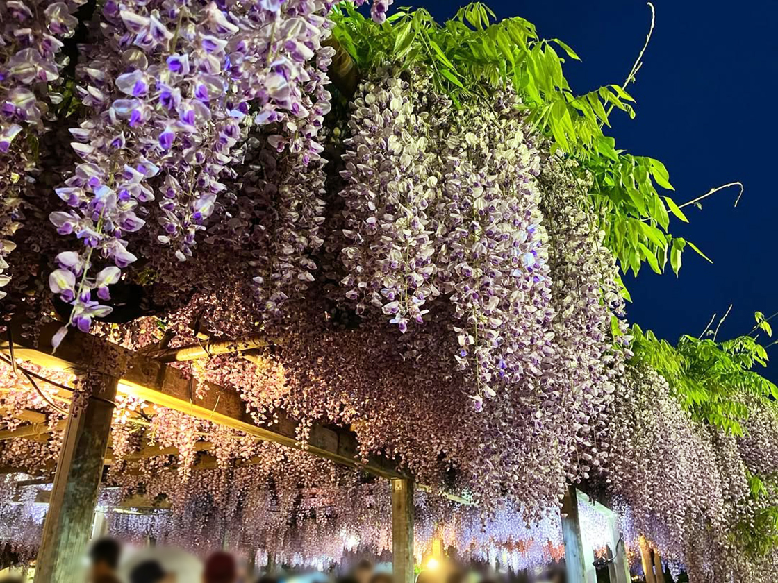 ライトアップによって夜景に浮かび上がる美しい“藤のカーテン”は、昼間の華やかさから表情を変え、思わず息をのむほどです…!