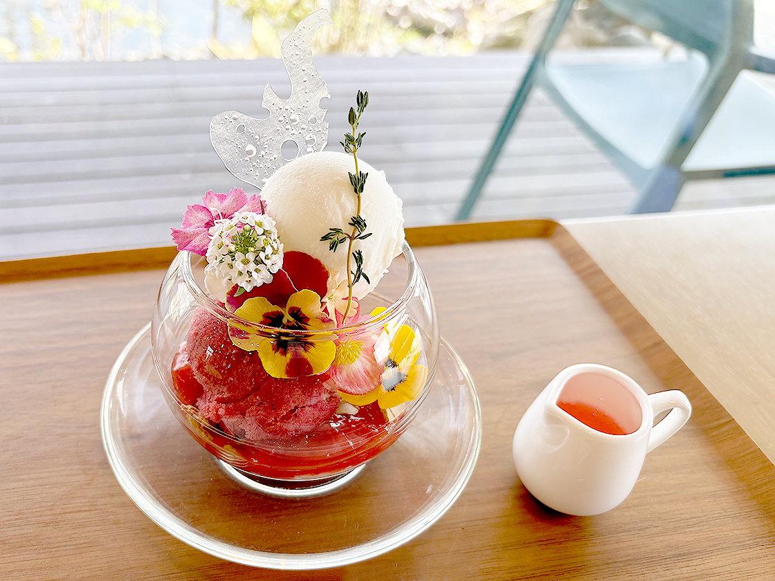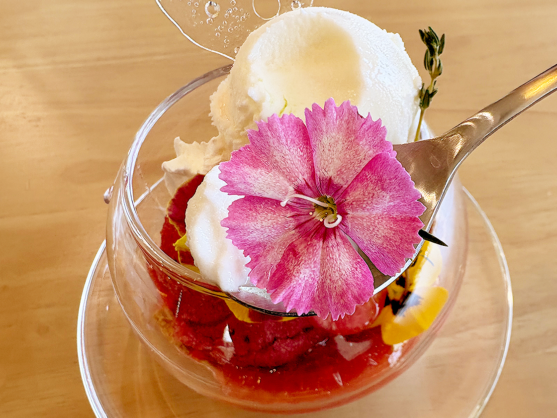 食べられるお花“エディブルフラワー”を大胆に使ったパフェは、とっても華やか♪