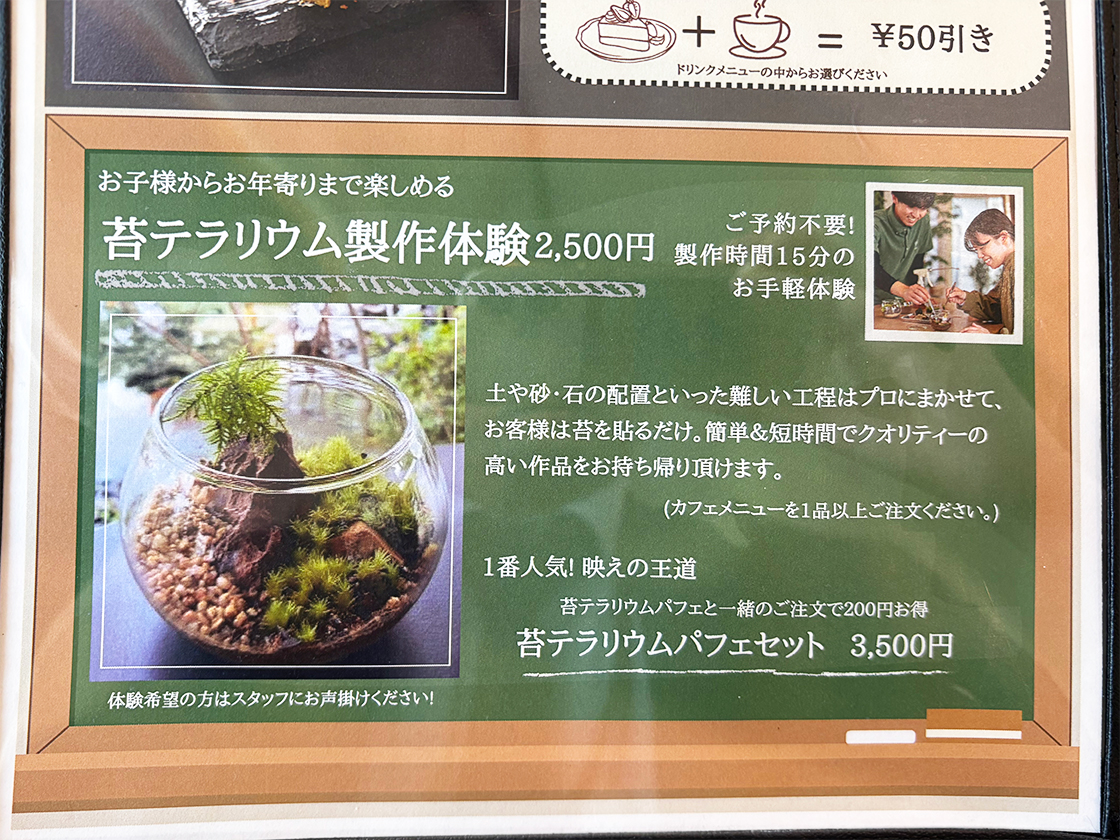 また、パフェとセットで「苔テラリウム制作体験」をするのもおすすめです!