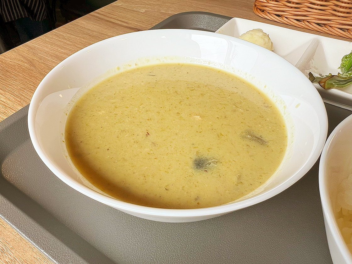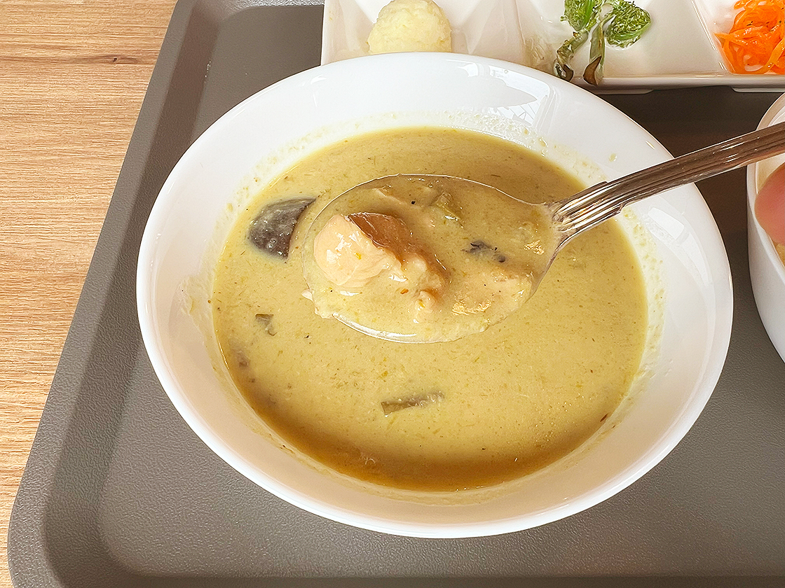 一口食べると、「グリーンチリの程よい辛さ」と「ココナッツの甘さ」、「ハーブやスパイスの辛さ」の調和された味が口いっぱいに広がっておいしい〜♪