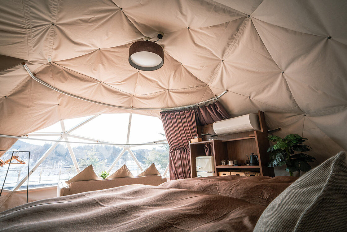 ナチュラルカラーで統一されたテント内には、セミダブルベッド(2台)やエアコン、冷蔵庫などが完備されていて、ホテルのような快適さでゆったり過ごせます♪