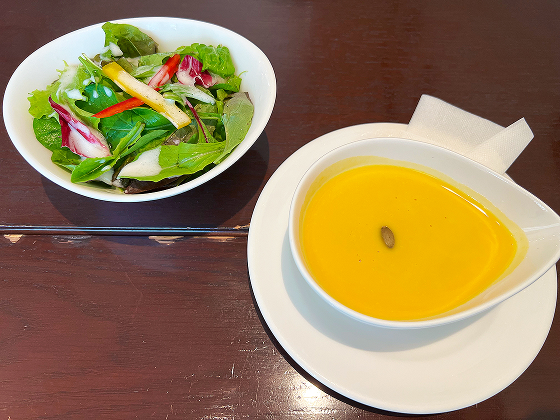 追加の「かぼちゃの冷製スープ」は、かぼちゃの自然な甘みとやさしい香りがふわっと広がり、なめらかな口あたりがやみつきになります♪