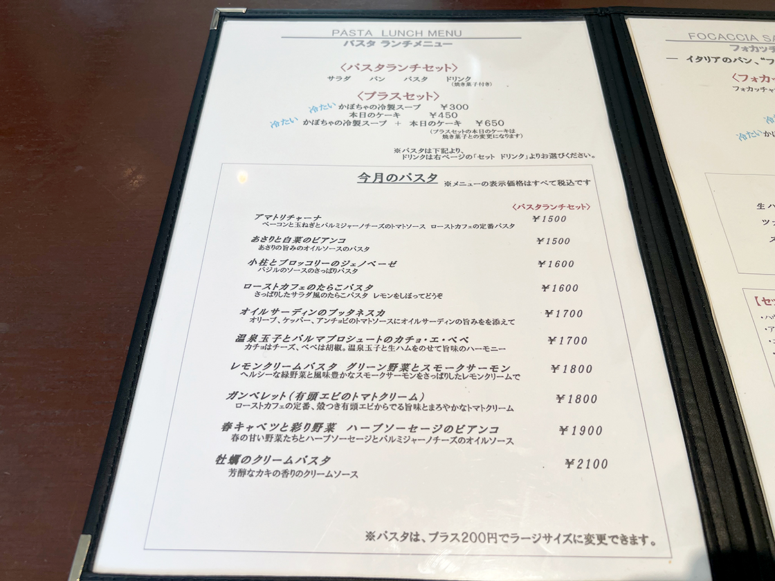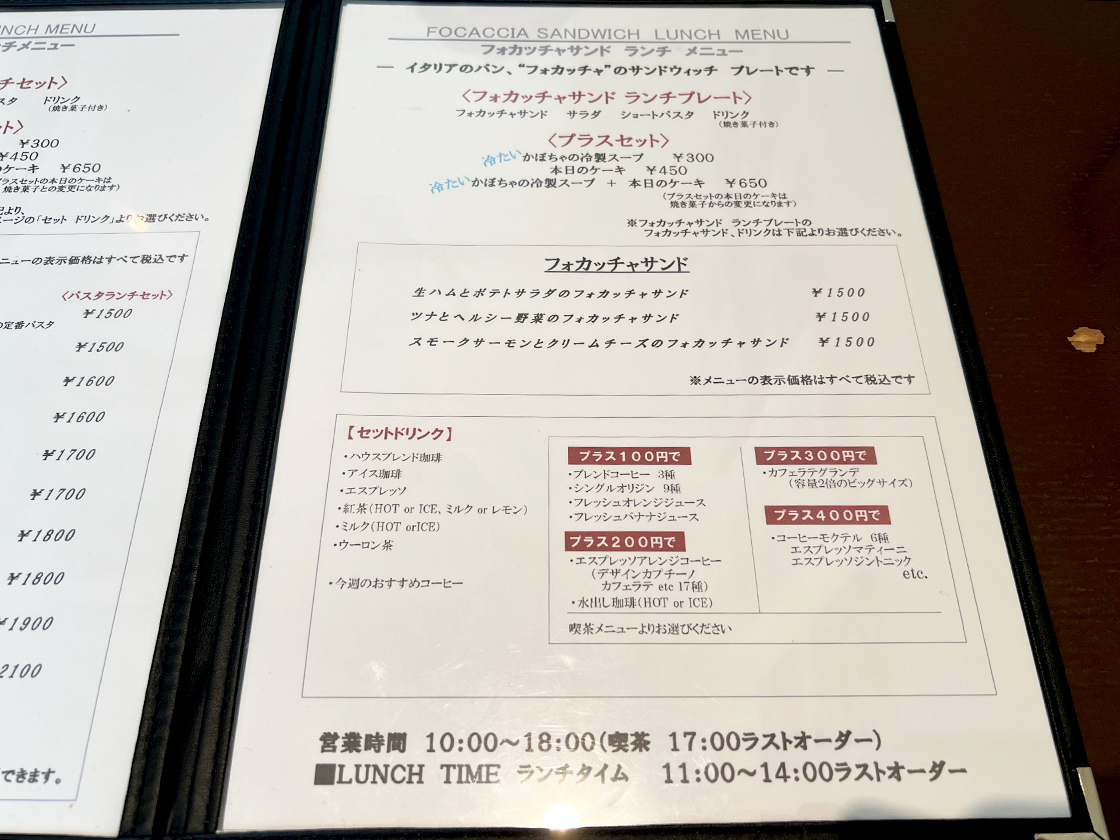 ランチメニューは、「パスタランチセット」と「フォカッチャサンド ランチプレート」がラインアップしています!