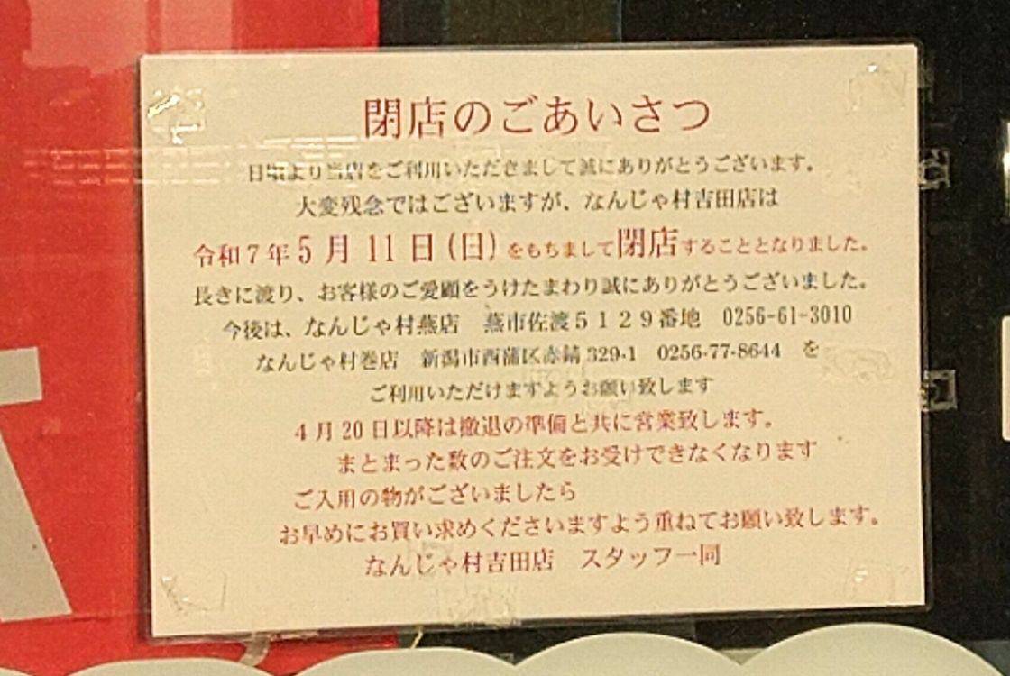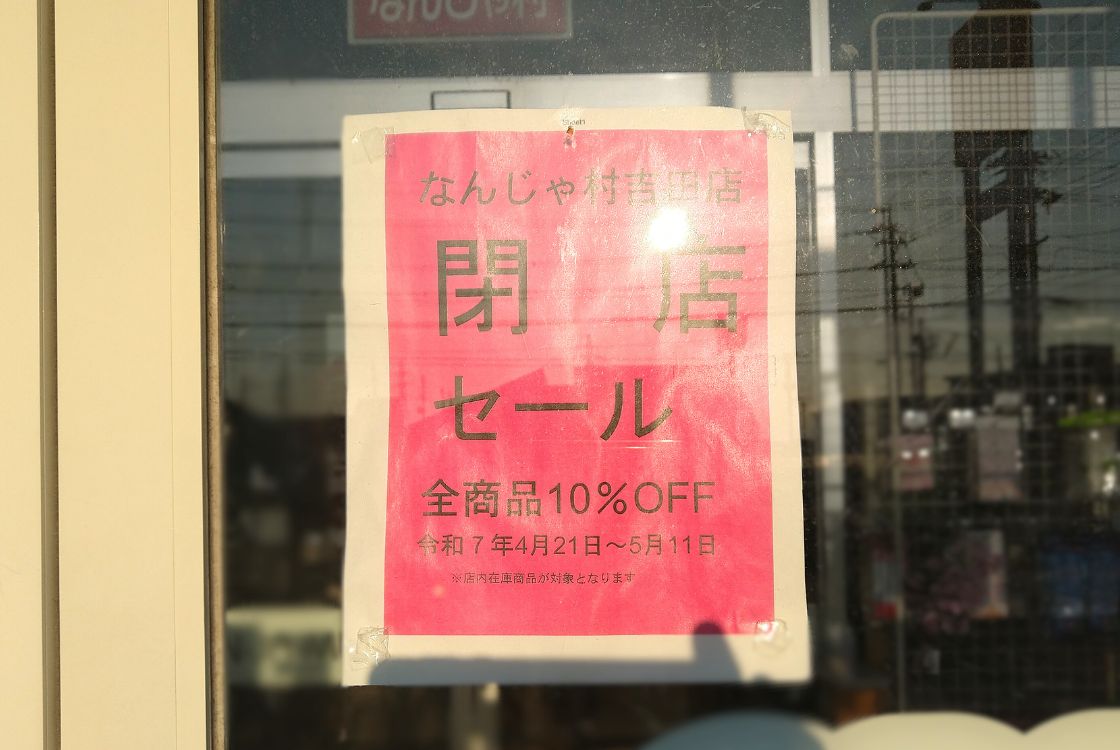 『なんじゃ村 吉田店』は、5月11日(日)の営業をもって閉店するとのこと。