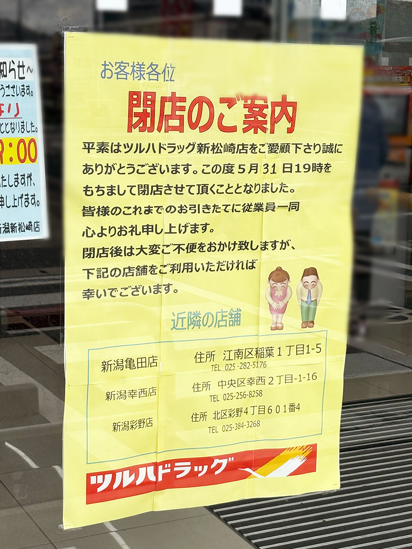 『ツルハドラッグ 新潟新松崎店』が5月31日(土)19時に閉店するようです。