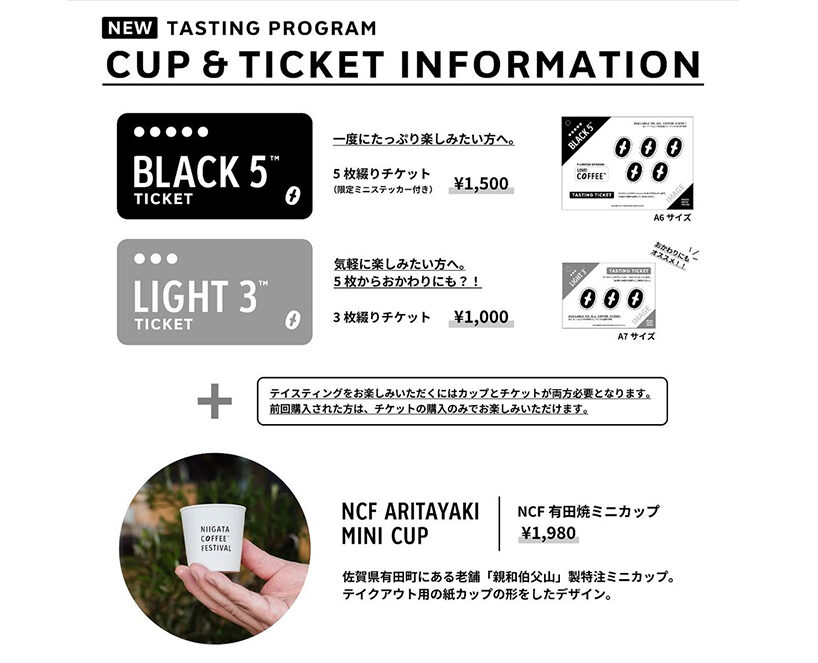 「NCF 有田焼ミニカップ」を昨年購入した方やチケット引換券をお持ちの方は、「テイスティングチケット(5枚綴り)」を1,200円の特別価格(1回限り)で購入できます!