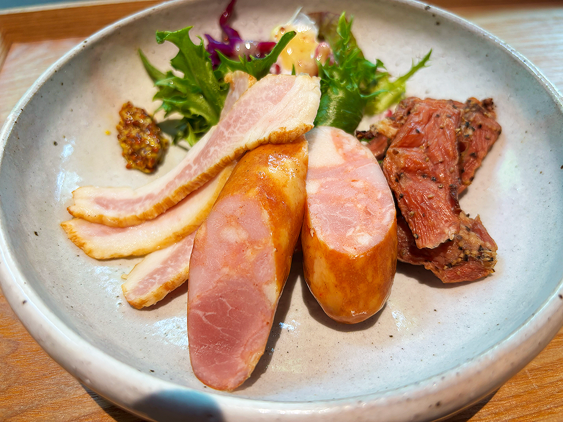 「酒粕ウインナー・豚トロベーコン・コメカミの燻製」は、どれも丁寧に仕上げられていて、ひと口ごとに旨味と香ばしさが広がります♪