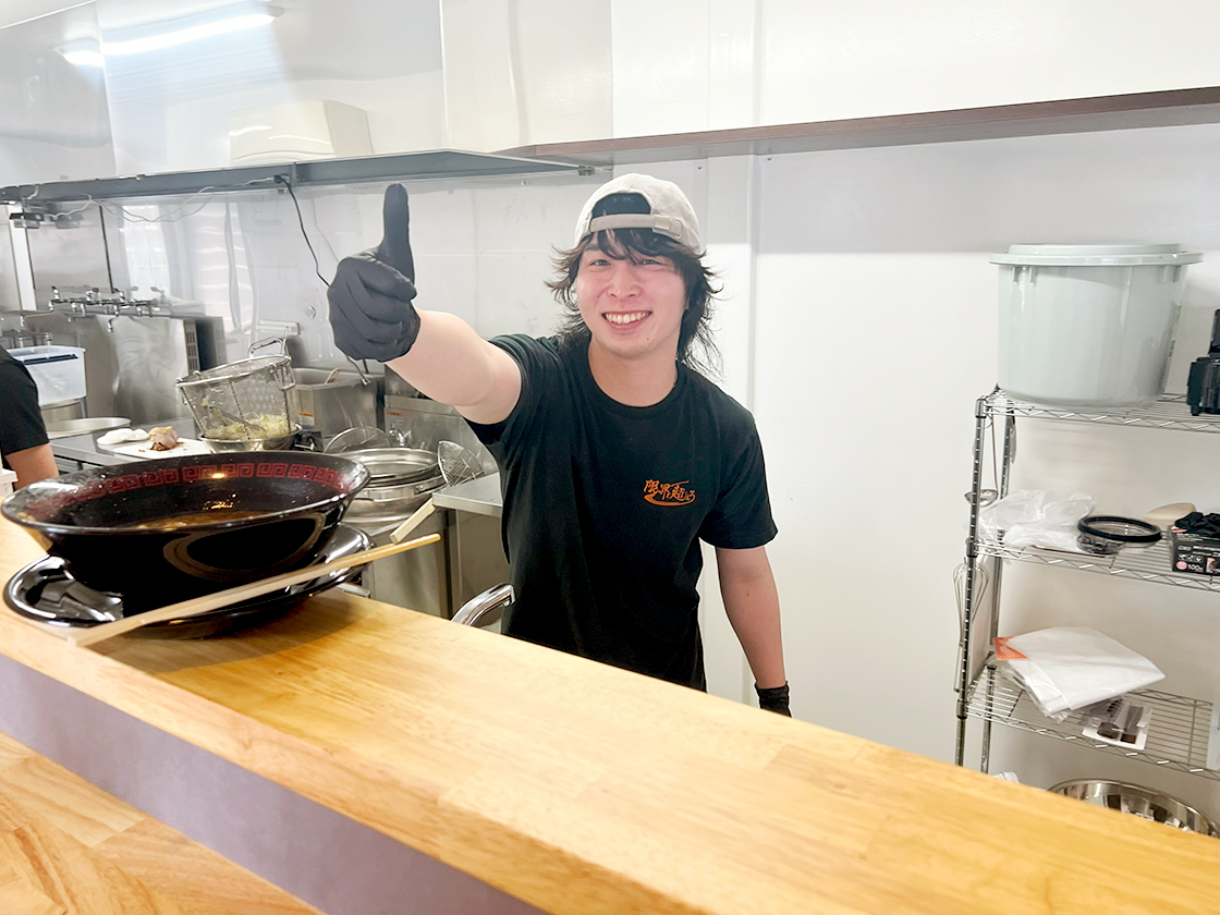 ラーメンが提供されるときは「いってらっしゃい!」、完食したら「グッジョブ!」の元気な掛け声が店内に響き渡りますよ♪