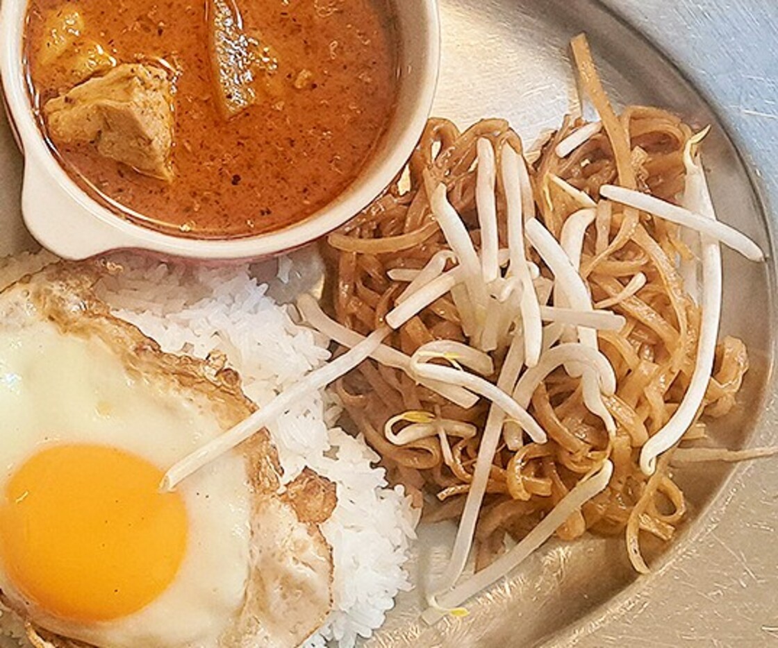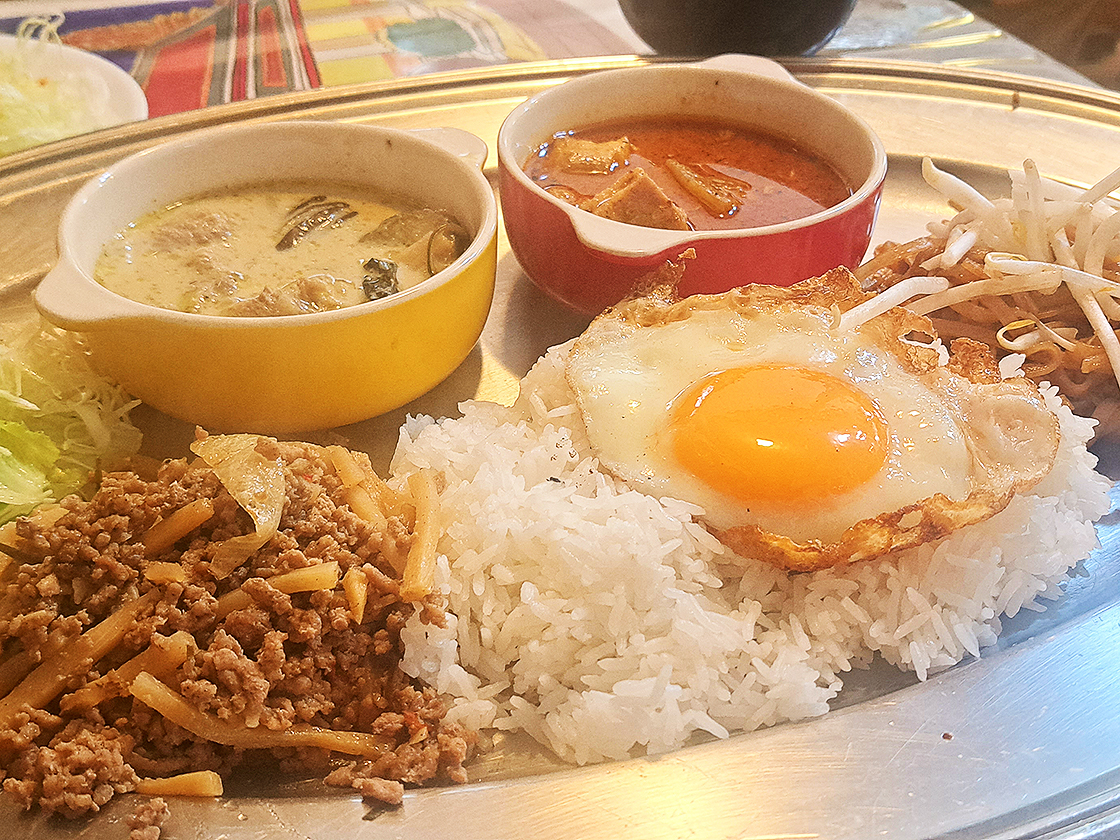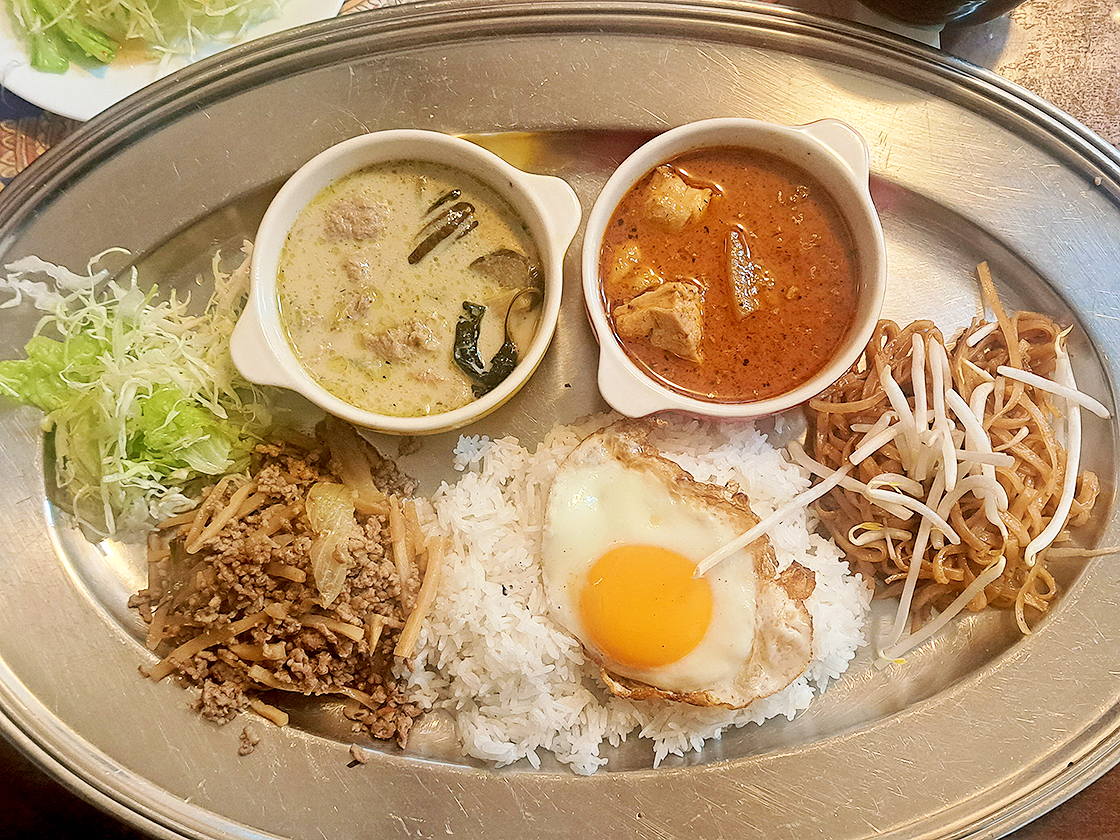 大きなプレートに、人気の料理(マッサマンカレー・グリーンカレー・パッタイ・ガパオ・ジャスミンライス)が盛り付けられた、“欲張りさんにぴったりのセット”ですよ♪