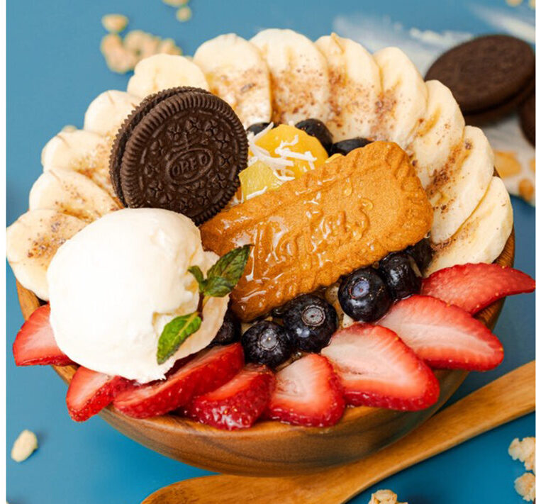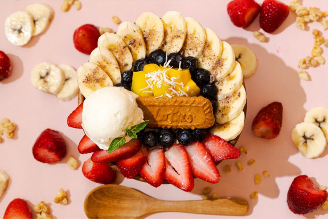 定番の「アサイーボウル」は、ベースのアサイーペースト・ハチミツ・グラノーラ・ロータスクッキーに、“4種類選べる旬のフルーツ(バナナ/イチゴ/パイン/ブルーベリー/マンゴー)”を盛り付ける一杯♪