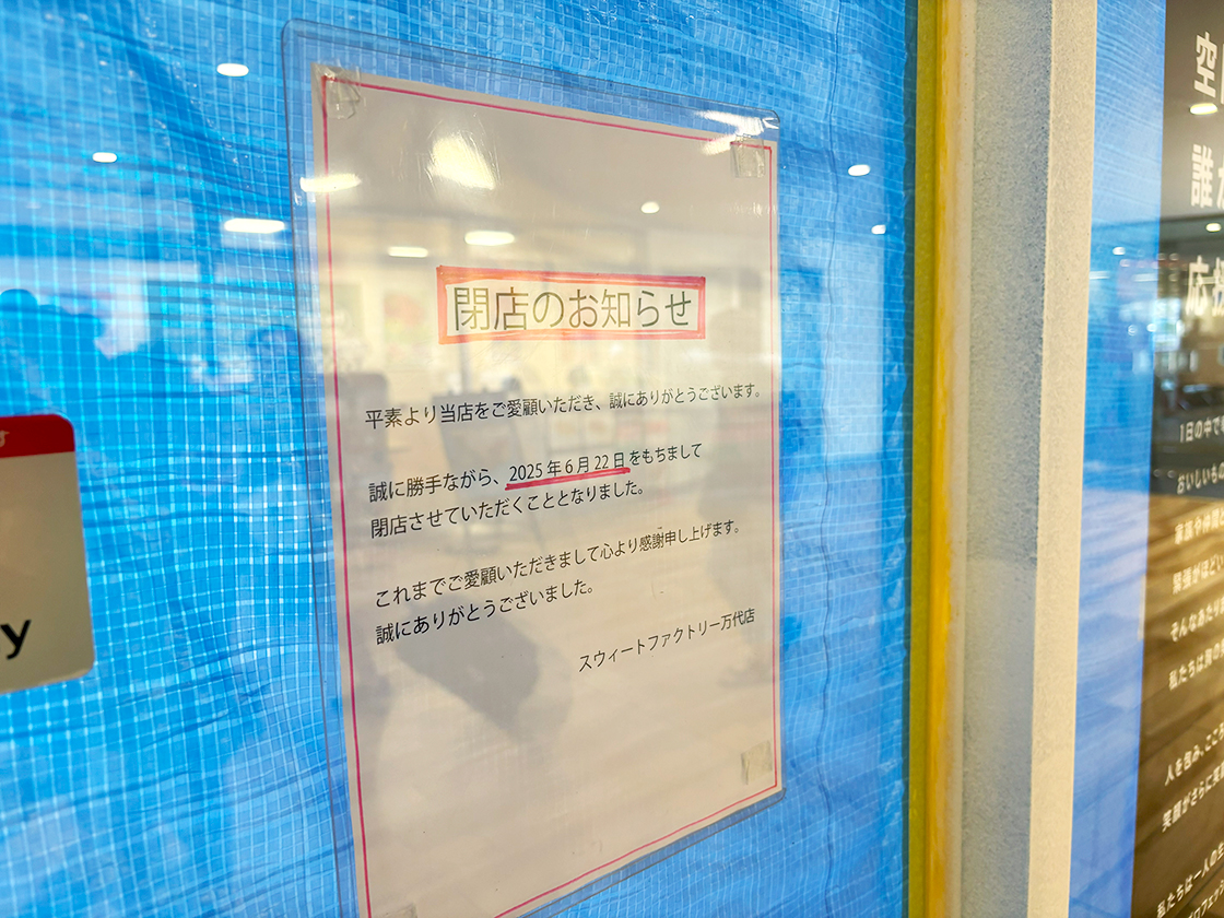 『スウィートファクトリープラス(SWEET-FACTORY+PLUS) 万代店』が6月22日(日)に閉店となりました。