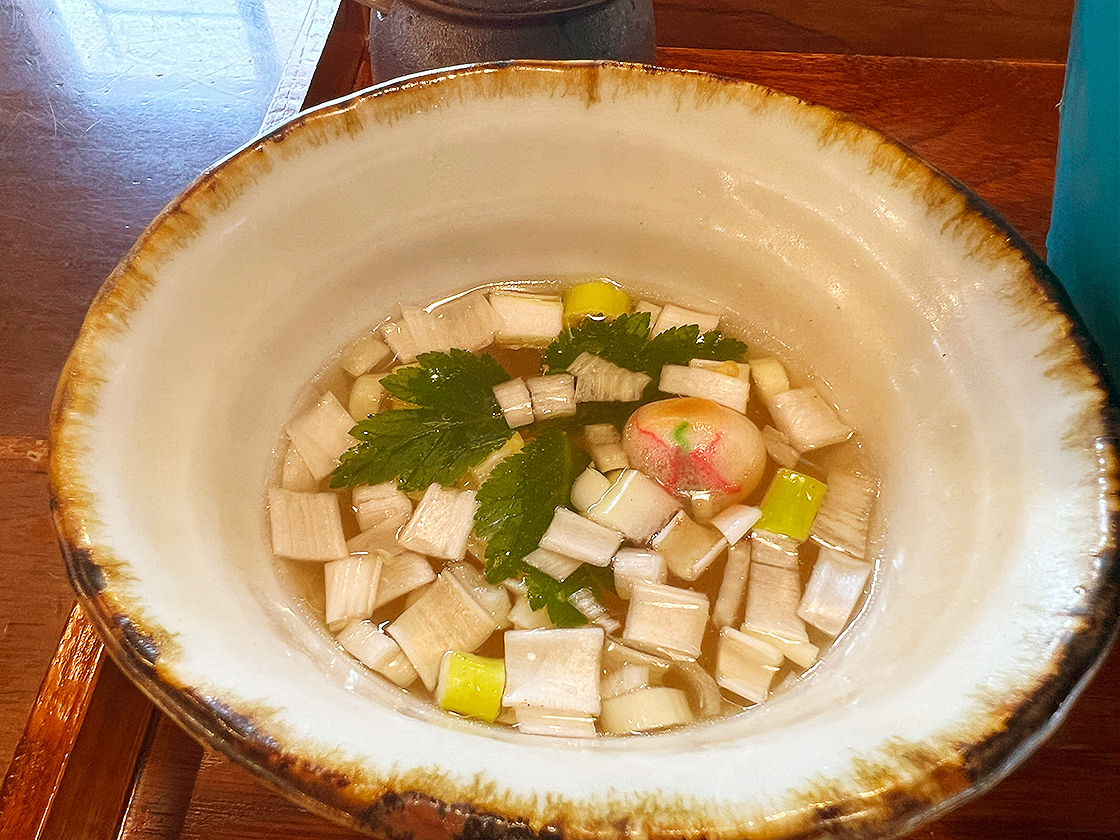 つけ汁に添えられた“毬の形をした麩”がかわいらしい…♪