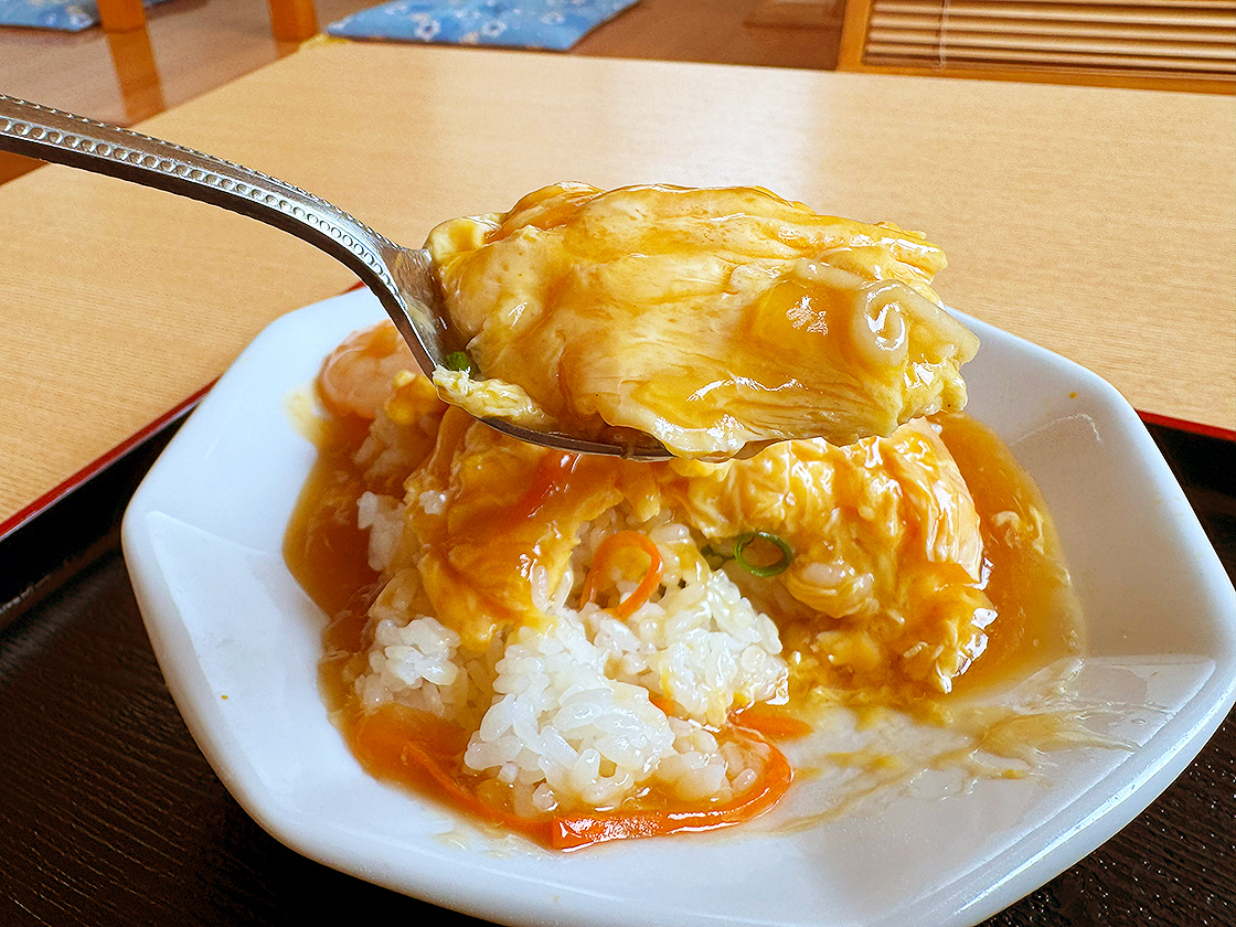 ふわふわの卵に包まれたご飯には、あっさりとした餡がたっぷりとかかっています!