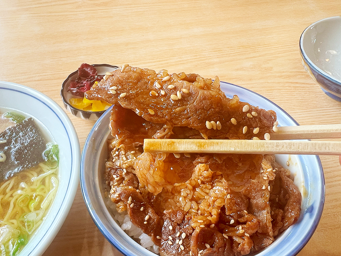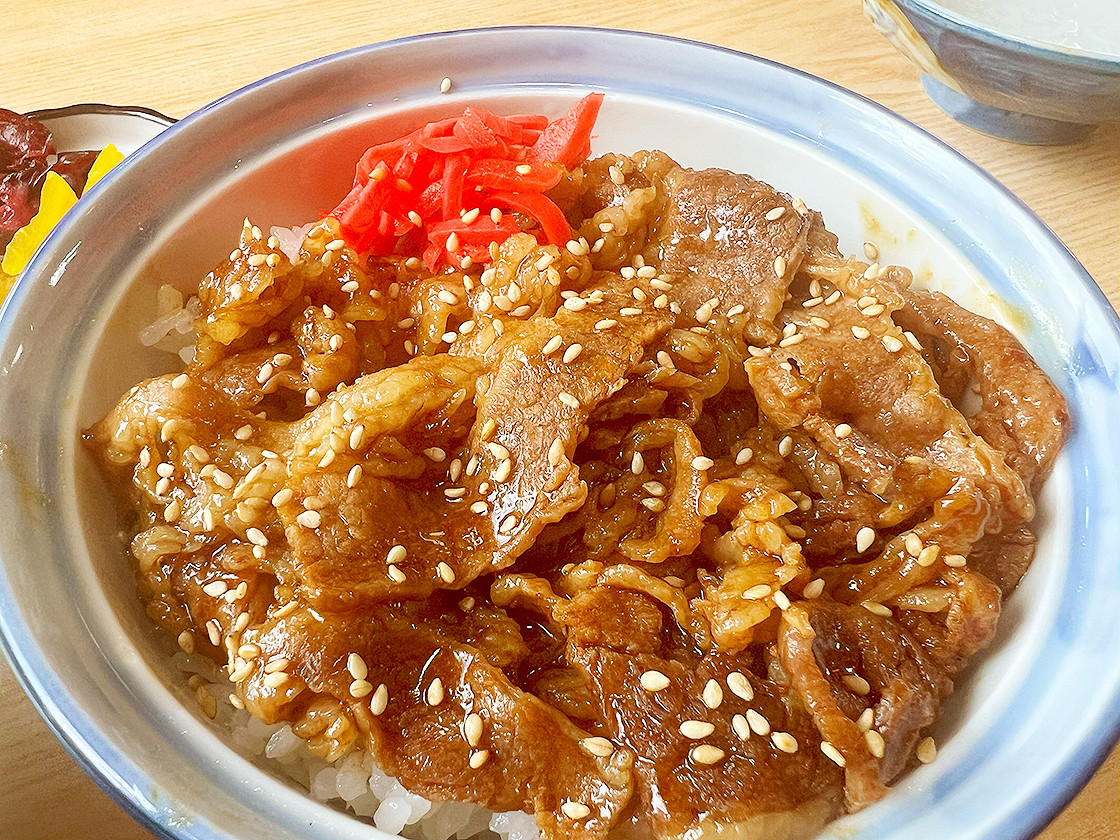 「焼肉丼」は、甘辛のタレが絡んだやわらかい牛バラ肉が、ごはんを隠すほど豪快にオン!