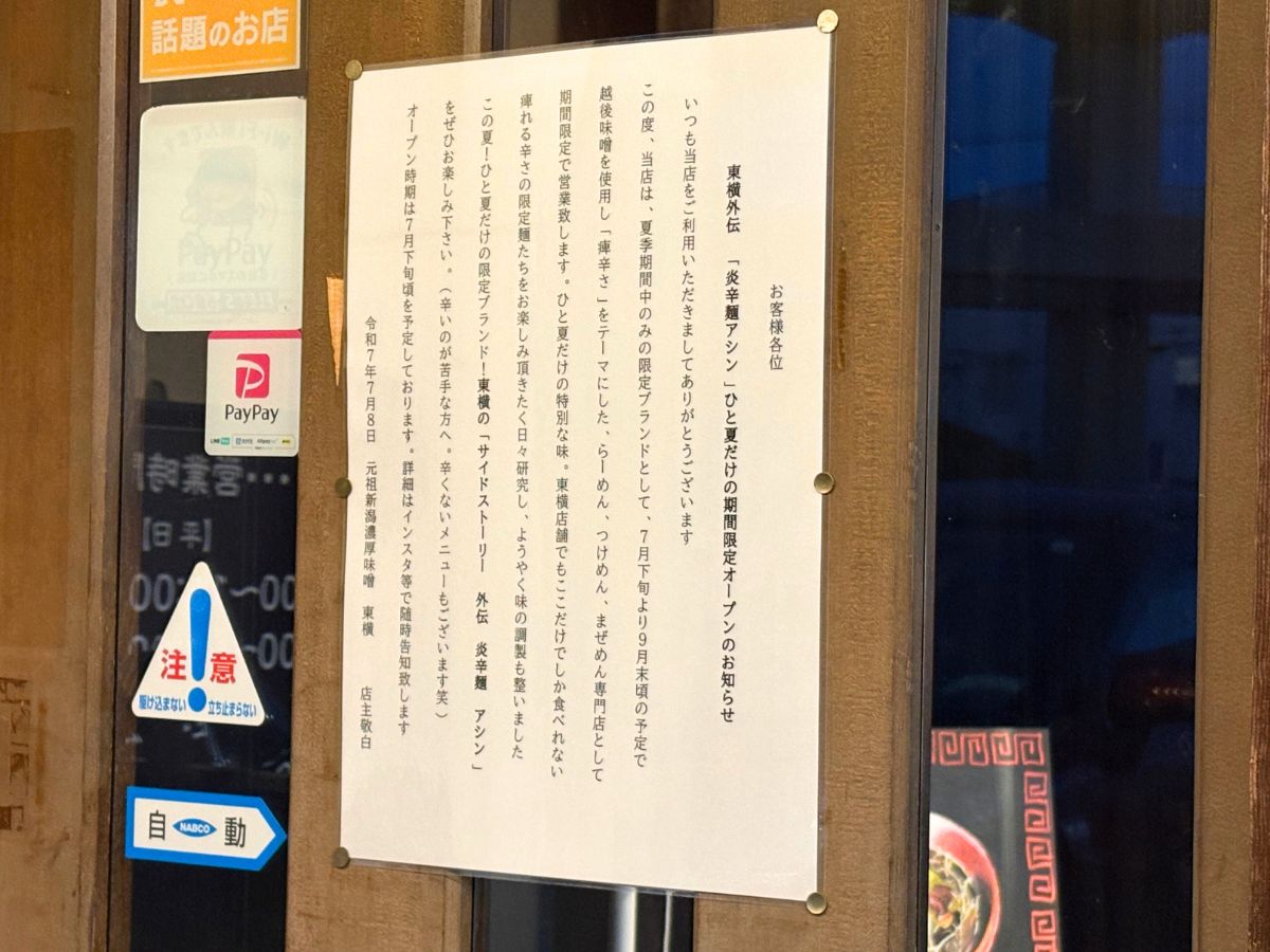 新潟市中央区にあるラーメン店「元祖新潟濃厚味噌 東横 愛宕店(とうよこ あたごてん)」で、夏季限定ブランド『東横外伝 炎辛麺アシン』が7月19日(土)からオープンします!