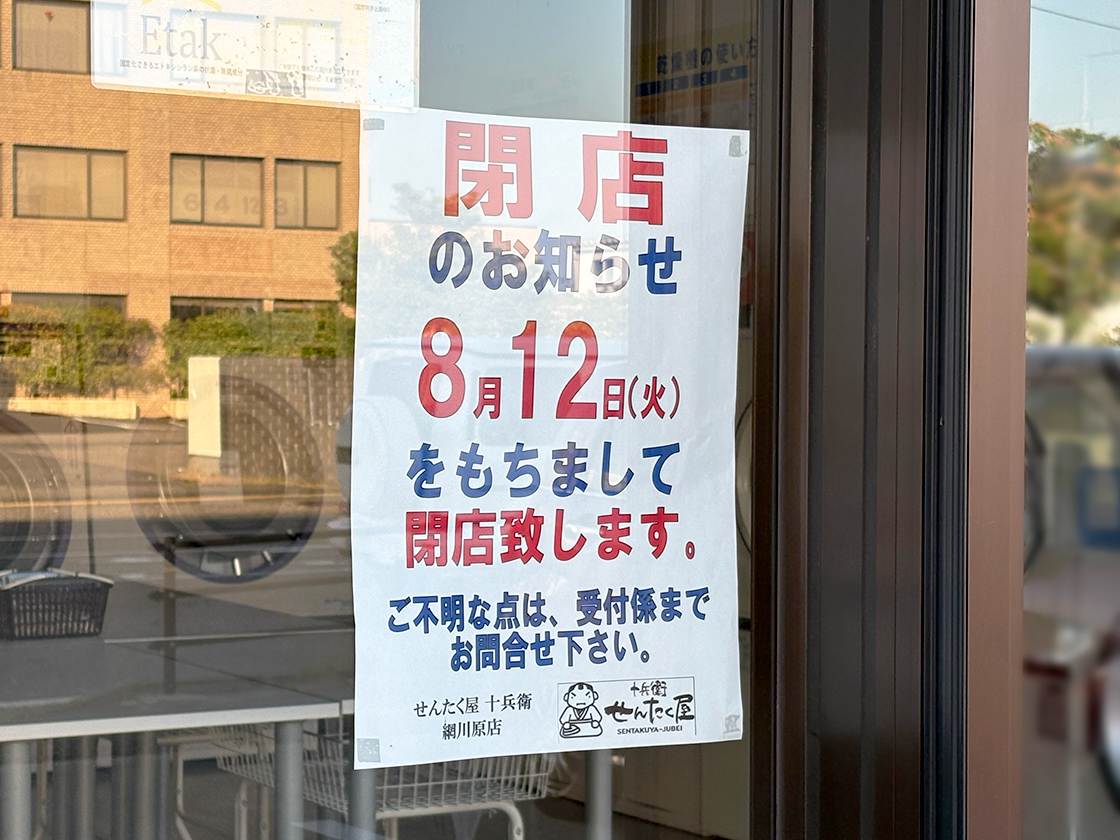 『せんたく屋十兵衛 網川原店(せんたくやじゅうべえ)』が8月12日(火)をもって閉店するようです。