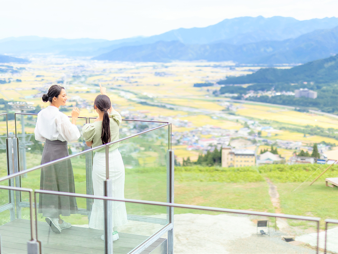スキー場の中腹にある展望テラス「ザ・ヴェランダ石打丸山」は、2022年の夏にオープンしたビュースポット♪