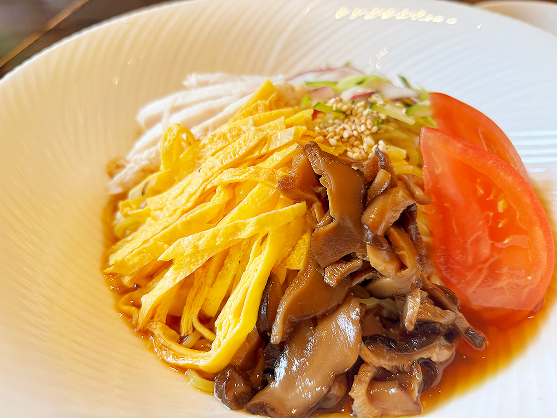 選べる3種類のメイン料理の一つ「五目冷麺(醤油タレ)」は、錦糸卵・蒸し鶏・トマトなどが美しく盛り付けられ、ホテルならではの上品な味わい♪