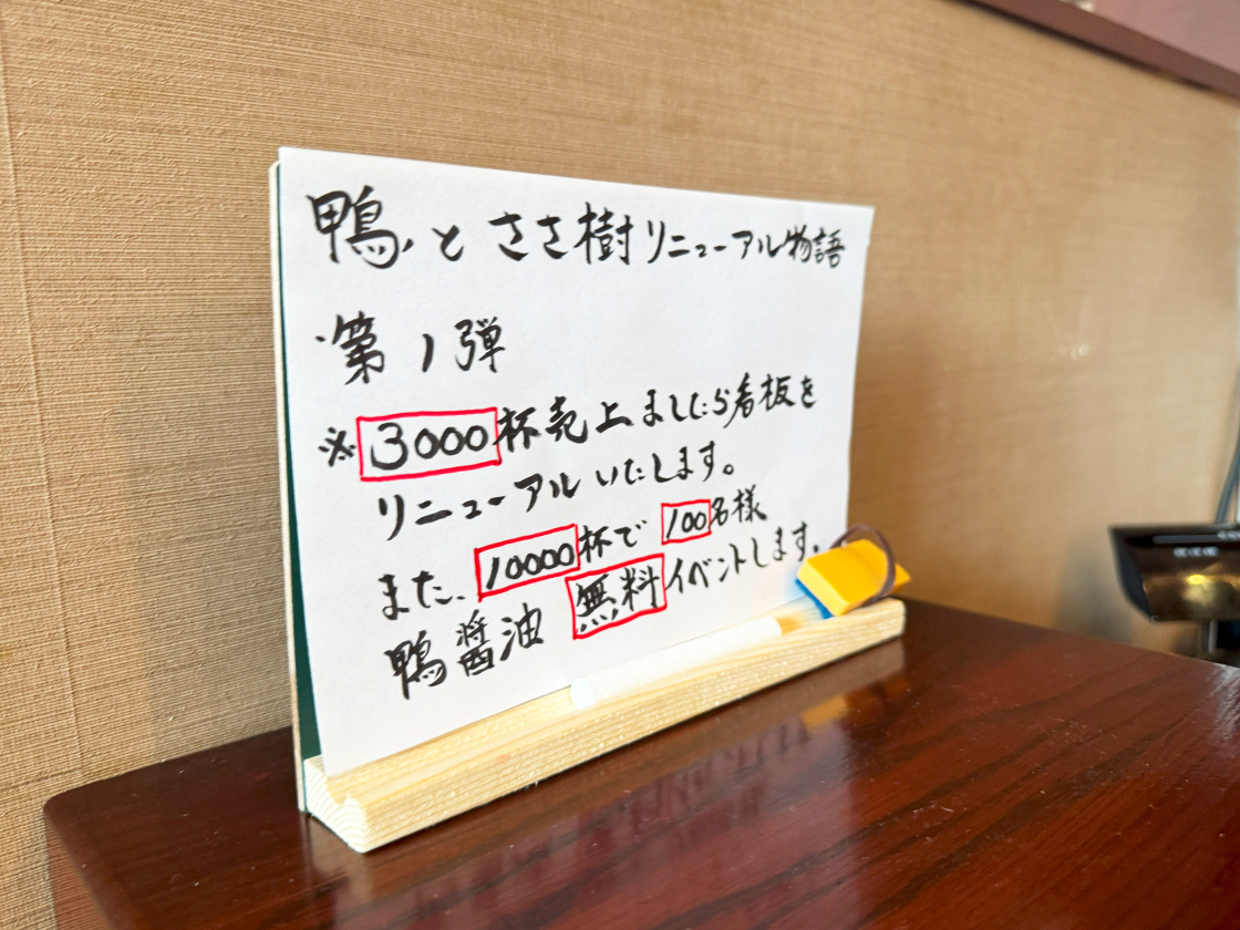 第1弾の内容は、“3,000杯を売上後に看板をリニューアル”、“10,000杯で100名様に鴨醤油無料イベント”とのこと!