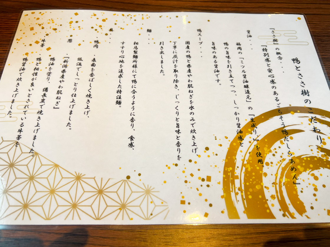 “特別感と安心感のあるごちそう鴨だしらぁめん”を概念として掲げ、各素材へのこだわりがメニュー表に記載されていますよ!