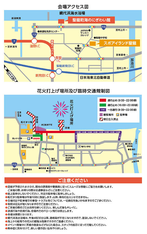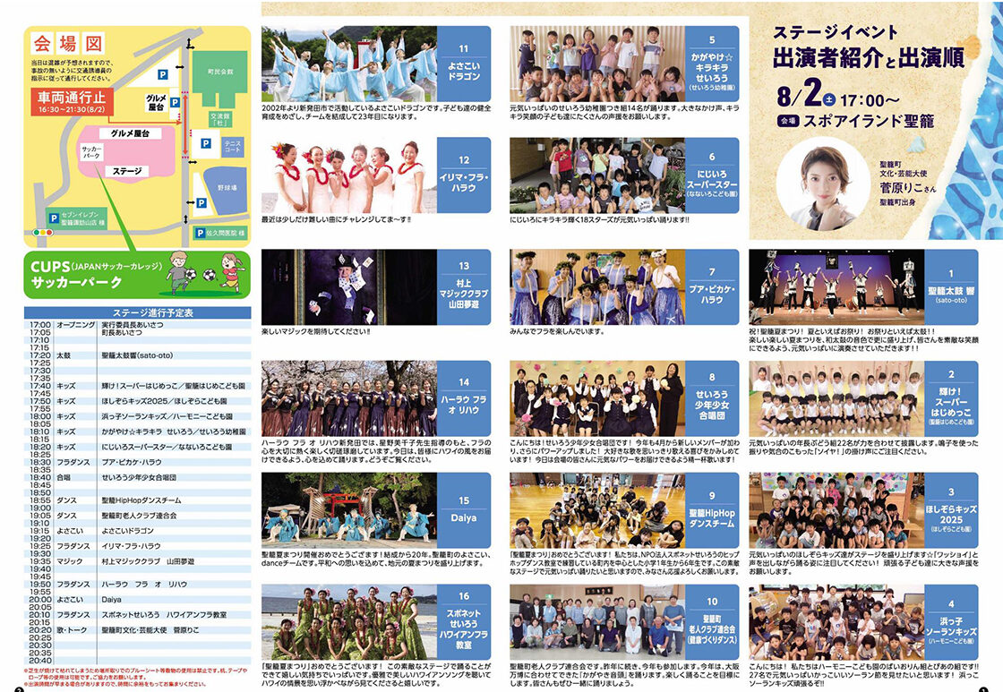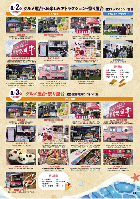 会場は、「スポアイランド聖籠(8月2日)」と「聖籠町海のにぎわい館(8月3日)」の2ヵ所で開催!