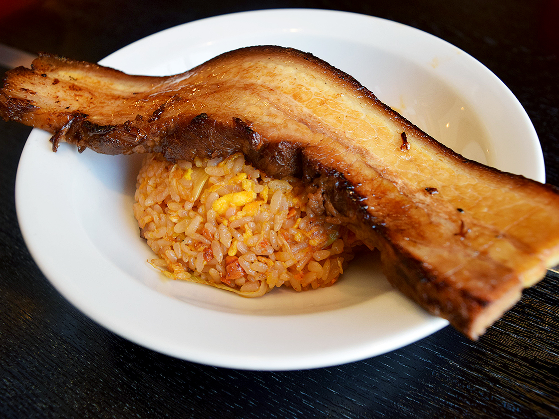皿からはみ出るほど大きく分厚いチャーシューは、少し甘めの味付けで、痺辛のチャーハンにベストマッチ!