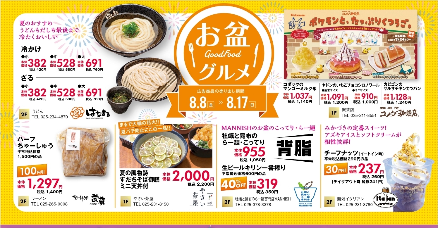 『サマーセール』が実施されるほか、『お盆イベントや夏の限定グルメ』が8月8日(金)~17日(日)までの期間限定で登場しますよ!