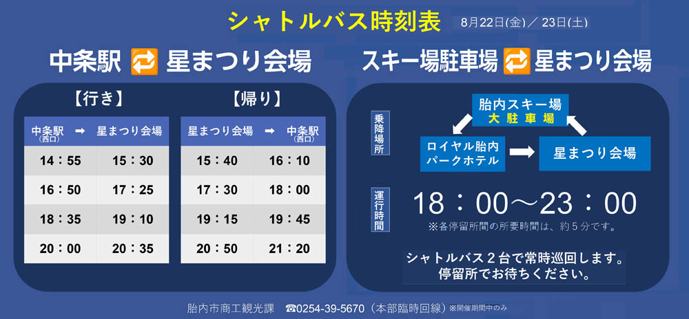 また、中条駅(西口)・胎内スキー場・ロイヤル胎内パークホテルからは、会場まで“シャトルバス(無料)”が運行されますよ!