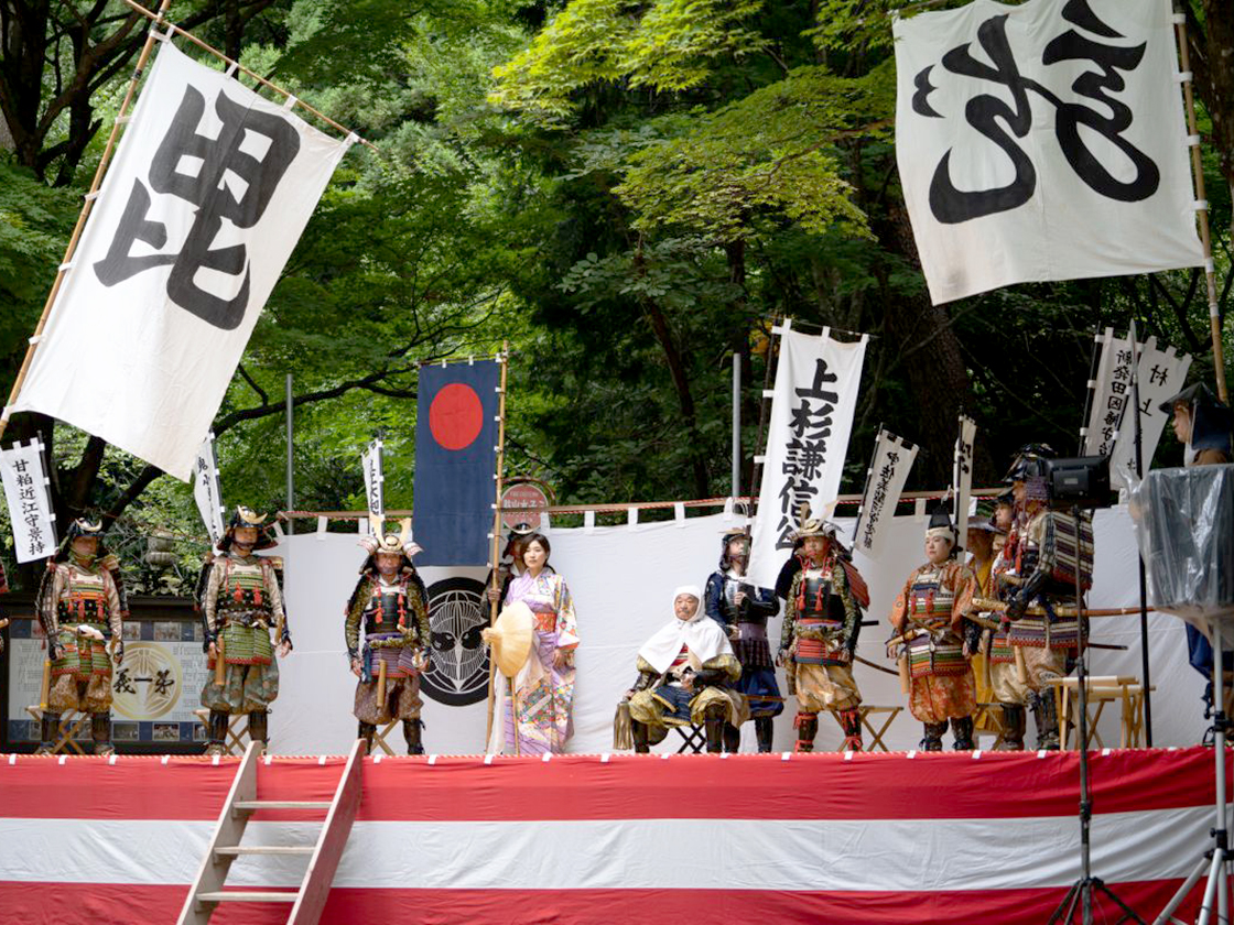 鎧兜に身を包んだ武者たちによる「川中島合戦の再現」は、戦国絵巻さながらの迫力ですよ!